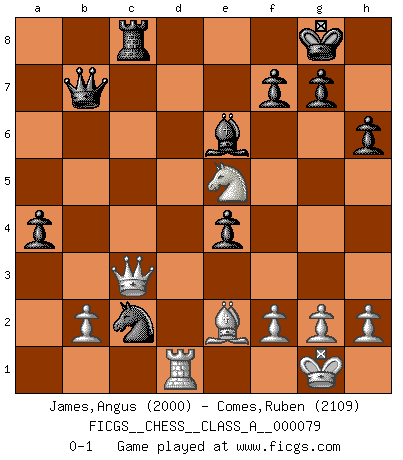 Last move : 0-1 2011 May 14 18:9:20 [Event "FICGS__CHESS__CLASS_A__000079"] [Site "FICGS"] [Date "2010.10.30"] [Round "1"] [White "James,Angus"] [Black "Comes,Ruben"] [Result "0-1"] [WhiteElo "2000"] [BlackElo "2109"] 1.e4 c5 2.Nf3 d6 3.d4 cxd4 4.Nxd4 Nf6 5.Nc3 a6 6.a4 e5 7.Nf3 Be7 8.Be2 O-O 9.O-O Be6 10.Ng5 Bd7 11.Be3 h6 12.Nf3 Be6 13.Nd2 Qc7 14.Bf3 Nbd7 15.a5 Rfc8 16.Re1 b5 17.axb6 Nxb6 18.Qe2 Qb7 19.Reb1 a5 20.Qb5 Bd8 21.Rc1 a4 22.Qb4 Qc6 23.Be2 d5 24.Nf3 dxe4 25.Nxe5 Qc7 26.Qd4 Qb8 27.Rd1 Bc7 28.Bf4 Nbd5 29.Nc6 Qb7 30.Nxd5 Nxd5 31.Bxc7 Rxc7 32.Ne5 Nb4 33.Rac1 Rxc2 34.Rxc2 Nxc2 35.Qc3 Rc8 0-1 This chess game has been lost on time (started : 2010.10.30 11:53:34) Sicilian : Najdorf Kingside Castling by player Black (move 8) Kingside Castling by player White (move 9) Player Black won this chess game. Follow this game move after move (download)Adequate compensation for a sacrifice is having a sound combination leading to a winning position; adequate compensation for a blunder is having your opponent snatch defeat from the jaws of victory. (Bruce A. Moon) Ich kenne keine einzige Person, die behaupten würde, Garri Kasparow sei ein guter Mensch (Nigel Short) Cuando tengo las piezas blancas, yo gano porque soy blanco; Cuando tengo las piezas negras, yo gano porque soy Bogolyubov. (Bogolyubov) Les pièces de l'échiquier étaient impitoyables. Elles le retenaient, elles l'absorbaient. Il y avait de l'horreur en cela, mais aussi une harmonie unique. Car, qu'y a-t-il dans le monde, à part les échecs ? (V. Nabokov) Better than a thousand days of diligent study is one day with a great teacher. (Japanese proverb)