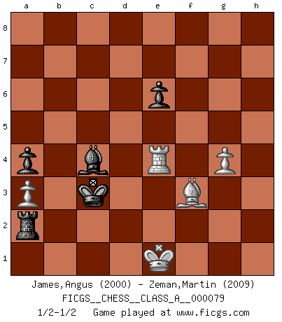 Last move : 1/2-1/2 2011 September 23 21:3:6 [Event "FICGS__CHESS__CLASS_A__000079"] [Site "FICGS"] [Date "2010.10.30"] [Round "1"] [White "James,Angus"] [Black "Zeman,Martin"] [Result "1/2-1/2"] [WhiteElo "2000"] [BlackElo "2009"] 1.e4 c5 2.Nf3 d6 3.d4 cxd4 4.Nxd4 Nf6 5.Nc3 a6 6.Bc4 e6 7.O-O b5 8.Bb3 Be7 9.Qf3 Qb6 10.Be3 Qb7 11.Qg3 O-O 12.Bh6 Ne8 13.Rad1 Nc6 14.Nxc6 Qxc6 15.Rfe1 Bb7 16.a3 Bf6 17.Bf4 a5 18.Bxd6 Nxd6 19.Qxd6 a4 20.Ba2 Rab8 21.Qxc6 Bxc6 22.e5 Be7 23.Ne4 b4 24.Nd6 bxa3 25.bxa3 Rb2 26.Bb1 Ra8 27.Nc4 Rb5 28.Nd6 Rc5 29.f4 Rb8 30.c4 Kf8 31.Re3 g5 32.g3 Bxd6 33.exd6 gxf4 34.gxf4 Rxc4 35.f5 Rg4+ 36.Rg3 Rxg3+ 37.hxg3 Ke8 38.fxe6 fxe6 39.Bxh7 Kd7 40.Kf2 Rf8+ 41.Ke1 Rh8 42.Bc2 Rh2 43.Bg6 Ra2 44.Rd3 Bb5 45.Re3 Bc4 46.Be4 Kxd6 47.g4 Kc5 48.Bf3 Kd4 49.Re4+ Kc3 1/2-1/2 Sicilian : Najdorf, Lipnitzky attack Kingside Castling by player White (move 7) Kingside Castling by player Black (move 11) 10 pieces endgame at move 46 : White KRBPP , Black KRBPP WHITE : King + 1 Rook 1 Bishop 2 Pawns BLACK : King + 1 Rook 1 Bishop 2 Pawns This chess game ended in a draw. Follow this game move after move (download)It began to feel as though you were playing against Chess itself. - On playing against Robert Fischer. (Walter Shipman) Nach Morphy wurde nichts neues mehr in der Behandlung offener Positionen gefunden. (Mikhail Moiseyevich Botvinik) Las combinaciones han sido siempre el aspecto más intrigante del Ajedrez. Los Maestros las buscan, el público las aplauden, los críticos las alaban. La razón se debe a que las combinaciones hacen posible que el Ajedrez sea más que un ejercicio matemático con una carencia de vida. Ellas son la poesía del juego, son del Ajedrez lo que la melodía es de la música. Ellas representan el triunfo de la mente sobre la materia. (Reuben Fine) Le moment que je préfère le plus dans une rencontre, c'est celui où je sens que la personnalité de l'adversaire se brise. (Robert Fischer) It's not the size of the dog in the fight, it's the size of the fight in the dog. (Mark Twain)