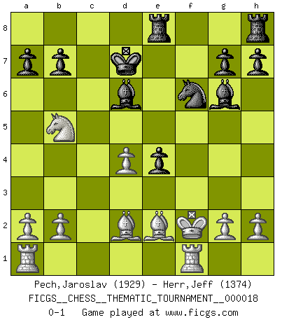 Last move : 0-1 2007 March 22 1:47:13 [Event "FICGS__CHESS__THEMATIC_TOURNAMENT__000018"] [Site "FICGS"] [Date "2006.11.27"] [Round "1"] [White "Pech,Jaroslav"] [Black "Herr,Jeff"] [Result "0-1"] [WhiteElo "1929"] [BlackElo "1374"] 1.f3 d5 2.Kf2 e5 3.e3 e4 4.d3 f5 5.dxe4 fxe4 6.c4 c6 7.Nc3 Nf6 8.cxd5 cxd5 9.Bb5+ Nc6 10.fxe4 dxe4 11.Qxd8+ Kxd8 12.Nge2 Bf5 13.Rf1 Bg6 14.Bd2 Kc7 15.Nd4 Nxd4 16.exd4 Bd6 17.Be2 Rae8 18.Nb5+ Kd7 0-1 This chess game has been lost on time (started : 2006.11.27 15:50:24) Gedult's Opening Player Black won this chess game. Follow this game move after move (download)Chess opens and enriches your mind. (Saudin Robovic) Fischer: 'Remis!?' Uhlmann: 'Aber es muss doch dreimal Zugwiederholung sein!' Fischer: 'Sie nehmen das Remis an, wie ich es sage, sonst spiele ich weiter und werde Sie dann schlagen!' (Robert James Fischer) Jugadores de primera clase pierden en contra de jugadores de segunda clase porque los jugadores de segunda clase a veces juegan una partida de primer clase. (Siegbert Tarrasch) Mais l'homme est une créature légère et illogique : semblable au joueur d'échecs, il n'aime que le processus du but à atteindre, non le but lui-même. (Dostoïevsky) He who defends everything defends nothing. (Frederick the Great)