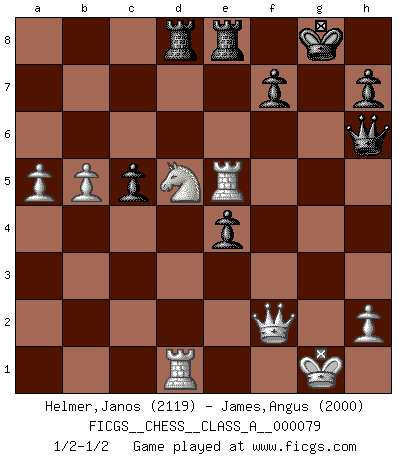Last move : 1/2-1/2 2011 June 13 23:26:57 [Event "FICGS__CHESS__CLASS_A__000079"] [Site "FICGS"] [Date "2010.10.30"] [Round "1"] [White "Helmer,Janos"] [Black "James,Angus"] [Result "1/2-1/2"] [WhiteElo "2119"] [BlackElo "2000"] 1.c4 g6 2.d4 Bg7 3.Nc3 Nf6 4.e4 d6 5.f3 O-O 6.Be3 Nc6 7.Nge2 a6 8.Qd2 Rb8 9.Nc1 e5 10.Nb3 exd4 11.Nxd4 Nxd4 12.Bxd4 Be6 13.Be2 c6 14.O-O b5 15.cxb5 axb5 16.b4 Re8 17.Rad1 Qe7 18.Qb2 Ra8 19.f4 Bc4 20.Bxc4 bxc4 21.a4 Rab8 22.b5 c5 23.Bxf6 Qxf6 24.e5 dxe5 25.Nd5 Qh4 26.f5 gxf5 27.Rxf5 c3 28.Qb3 Rbd8 29.a5 e4 30.Qc4 Be5 31.g3 Bxg3 32.Qe2 c2 33.Qxc2 Be5 34.Qf2 Qh6 35.Rxe5 1/2-1/2 English Opening Kingside Castling by player Black (move 5) Kingside Castling by player White (move 14) This chess game ended in a draw. Follow this game move after move (download)Chess is mental torture. (Garry Kasparov) Wer mein Gambit spielt, muß bereit sein, alle Brücken hinter sich abzubrechen. Es verändert den ganzen Menschen. Es wirkt wie ein Zauberstab und fördert verkümmerte, gute Charakter- eigenschaften wieder zu Tage. (Emil Joseph Diemer) El Ajedrez hace al hombre ser mas sabio y ver mas claro. (Vladimir Putin) Aux échecs, les retours au sommet sont rares : les dommages psychologiques consécutifs à une défaite sont trop sévères. (Daily Telegraph) The existence of forgetting has never been proved: We only know that some things don't come to mind when we want them. (Friedrich Nietzsche)