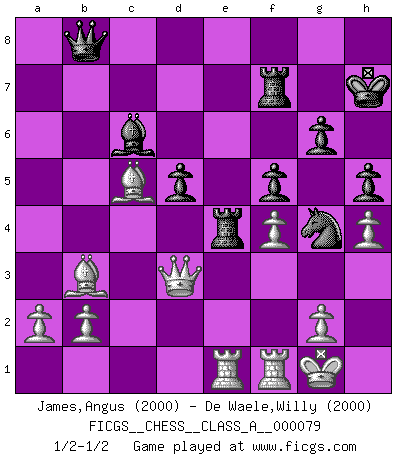 Last move : 1/2-1/2 2011 March 1 22:54:46 [Event "FICGS__CHESS__CLASS_A__000079"] [Site "FICGS"] [Date "2010.10.30"] [Round "1"] [White "James,Angus"] [Black "De Waele,Willy"] [Result "1/2-1/2"] [WhiteElo "2000"] [BlackElo "2000"] 1.e4 c5 2.Nf3 d6 3.d4 cxd4 4.Nxd4 Nf6 5.Nc3 a6 6.Bc4 e6 7.O-O b5 8.Bb3 Be7 9.Qf3 Qb6 10.Be3 Qb7 11.Qg3 b4 12.Na4 Nbd7 13.f3 O-O 14.Rad1 Ne5 15.c3 a5 16.cxb4 axb4 17.Nb6 Nh5 18.Qh3 Qxb6 19.Qxh5 Qa6 20.f4 Nc4 21.Bc1 Bd7 22.Rf3 g6 23.Qh6 f5 24.exf5 exf5 25.Rfd3 d5 26.Kh1 Rae8 27.Nf3 Bc6 28.Be3 Rf7 29.Bd4 Bf8 30.Qh4 Re4 31.Ng5 Be7 32.Qh6 Bxg5 33.Qxg5 Qb7 34.h4 Qe7 35.Qg3 Qf8 36.Rf3 Re2 37.Rf2 Re4 38.Kg1 Qe8 39.Bc5 Ne3 40.Re1 Ng4 41.R2f1 h5 42.Bxb4 Qb8 43.Bc5 Kh7 44.Qd3 1/2-1/2 Sicilian : Najdorf, Lipnitzky attack Kingside Castling by player White (move 7) Kingside Castling by player Black (move 13) This chess game ended in a draw. Follow this game move after move (download)In the perfect Chess combination as in a first-rate short story, the whole plot and counter-plot should lead up to a striking finale, the interest not being allayed until the very last moment. (Yates and Winter) Der Schachmeister von Heute braucht Courage, einen Killerinstinkt, Ausdauer und Arroganz. (Larry Evans) Ciertamente, de todas la drogas del mundo, el Ajedrez debe ser el mas placentero permamentemente. (Assiac) Les Echecs sont affaire de jugement sensible. Savoir quand frapper et quand esquiver. (Fischer) All the troubles of the world come from being unable to sit alone in a quiet room. (Blaise Pascal)