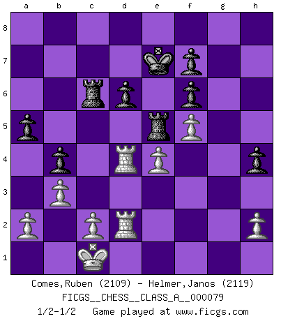 Last move : 1/2-1/2 2011 May 19 19:26:2 [Event "FICGS__CHESS__CLASS_A__000079"] [Site "FICGS"] [Date "2010.10.30"] [Round "1"] [White "Comes,Ruben"] [Black "Helmer,Janos"] [Result "1/2-1/2"] [WhiteElo "2109"] [BlackElo "2119"] 1.e4 c5 2.Nf3 Nc6 3.d4 cxd4 4.Nxd4 Nf6 5.Nc3 d6 6.Bg5 e6 7.Qd2 a6 8.f3 Be7 9.O-O-O Bd7 10.g4 b5 11.Be3 Nxd4 12.Qxd4 e5 13.Qd2 b4 14.Ne2 Qa5 15.g5 Nh5 16.Kb1 Be6 17.b3 Rd8 18.Ng3 Nf4 19.Bxf4 exf4 20.Nh5 Qxg5 21.Nxf4 Bf6 22.Nd5 Qxd2 23.Nxf6+ gxf6 24.Rxd2 a5 25.f4 Ke7 26.f5 Bd7 27.Be2 Bc6 28.Bf3 Rc8 29.Re1 Bb5 30.Be2 Bxe2 31.R1xe2 Rc5 32.Kb2 Rhc8 33.Rd3 h5 34.Red2 R8c6 35.Kc1 Re5 36.Rd4 h4 1/2-1/2 Sicilian defense Queenside Castling by player White (move 9) This chess game ended in a draw. Follow this game move after move (download)The boy (then a 12 year old boy named Anatoly Karpov) doesn't have a clue about Chess, and there's no future at all for him in this profession. (Mikhail Botvinnik) Ich würde mich als ganz normalen Jungen bezeichnen [Im Alter von 12]. (Sergej Karjakin) Cuando tengas duda... ¡juega al Ajedrez!. (Tevis) Même un GMI sait rarement calculer sur plus de cinq coups une attaque à sacrifices. (Rudolf Spielmann) No, no, you're not thinking; you're just being logical. (Niels Bohr)