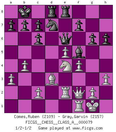 Last move : 1/2-1/2 2011 January 26 4:39:34 [Event "FICGS__CHESS__CLASS_A__000079"] [Site "FICGS"] [Date "2010.10.30"] [Round "1"] [White "Comes,Ruben"] [Black "Gray,Garvin"] [Result "1/2-1/2"] [WhiteElo "2109"] [BlackElo "2157"] 1.e4 e5 2.Nf3 Nc6 3.d4 exd4 4.Nxd4 Bc5 5.Nxc6 Qf6 6.Qf3 dxc6 7.Nc3 Be6 8.Qg3 O-O-O 9.Be3 Bxe3 10.Qxe3 Kb8 11.Bd3 Ne7 12.f4 Rhe8 13.O-O g6 14.Rae1 Nc8 15.e5 Qe7 16.a3 Nb6 17.Ne4 Bf5 18.Qf2 Nd7 19.b4 h6 20.Re2 Qe6 21.h3 1/2-1/2 Scotch game Queenside Castling by player Black (move 8) Kingside Castling by player White (move 13) This chess game ended in a draw. Follow this game move after move (download)Could we look into the head of a Chess player, we should see there a whole world of feelings, images, ideas, emotion and passion. (Alfred Binet) Die unerbitterlichsten Regeln im Schach sind die Ausnahmen. (Savielly Grigorievitsch Tartakower) No nos podemos resistir a la fascinación de un sacrificio ya que la pasión por los sacrificios es parte de la naturaleza de un jugador de Ajedrez. (Rudolf Spielman) Botvinnik disait en comparant les échecs à la musique: Il existe une science dont le but est l'étude de l'acoustique et des sons. Mais il y a aussi un art qui se sert de l'océan des sons : c'est la musique. De toute évidence, il en est de même pour la pensée. La logique est l'étude des lois de la réflexion et les échecs reflètent, en tant qu'art, le côté logique de la réflexion, sous la forme d'images artistiques... Extrait de Fischer - Spassky, Reykjavik 1972 par Alexander & F. Wyndham (Ed. Solar), p 37. A good aphorism is too hard for the tooth of time, and is not worn away with the centuries, although it serves as food for every speech. (Friedrich Nietzsche)