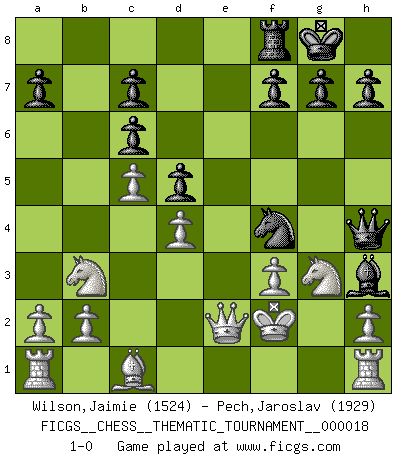 Last move : 1-0 2007 March 13 19:37:57 [Event "FICGS__CHESS__THEMATIC_TOURNAMENT__000018"] [Site "FICGS"] [Date "2006.11.27"] [Round "1"] [White "Wilson,Jaimie"] [Black "Pech,Jaroslav"] [Result "1-0"] [WhiteElo "1524"] [BlackElo "1929"] 1.f3 d5 2.Kf2 e5 3.c3 Nf6 4.d4 Bd6 5.e3 Nc6 6.Bb5 O-O 7.Ne2 e4 8.Bxc6 exf3 9.gxf3 bxc6 10.Ng3 Qd7 11.Nd2 Qh3 12.c4 Nh5 13.Qg1 Qh4 14.c5 Bf4 15.exf4 Nxf4 16.Qf1 Bh3 17.Qd1 Rae8 18.Nb3 Re2+ 19.Qxe2 1-0 This chess game has been lost on time (started : 2006.11.27 15:50:24) Gedult's Opening Kingside Castling by player Black (move 6) Player White won this chess game. Follow this game move after move (download)Chess makes man wiser and clear-sighted. (Vladimir Putin) Auf jeden Fall musst du zuerst Rechtsanwalt werden, damit du deine eigenen Interessen und die deiner Familie vertreten kannst. [Brief an seinen Sohn] (José Raúl Capablanca) La última cosa en que Fischer estaba interesado era en tonterías, siempre y cuando el Ajedrez estuviera involucrado. (Elie Agur) Un millionnaire : 'Monsieur Steinitz ! Vous ne participez aux tournois que pour l'argent, alors que moi je n'y viens que pour l'honneur.' Steinitz : 'Chacun joue pour ce qu'il n'a pas'... Is not life a hundred times too short to bore ourselves ? (Friedrich Nietzsche)
