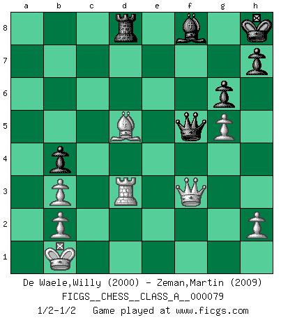 Last move : 1/2-1/2 2010 December 19 9:27:56 [Event "FICGS__CHESS__CLASS_A__000079"] [Site "FICGS"] [Date "2010.10.30"] [Round "1"] [White "De Waele,Willy"] [Black "Zeman,Martin"] [Result "1/2-1/2"] [WhiteElo "2000"] [BlackElo "2009"] 1.e4 c5 2.Nf3 d6 3.d4 cxd4 4.Nxd4 Nf6 5.Nc3 a6 6.Be3 e5 7.Nb3 Be6 8.f3 Nbd7 9.Qd2 b5 10.O-O-O Be7 11.g4 O-O 12.g5 b4 13.Ne2 Ne8 14.f4 exf4 15.Bxf4 Nc5 16.Bg2 Nxb3+ 17.axb3 a5 18.Nd4 Qd7 19.Nxe6 fxe6 20.Kb1 a4 21.Bh3 Kh8 22.Rhf1 Qb7 23.Qd3 Nc7 24.Be3 axb3 25.Rxf8+ Bxf8 26.cxb3 d5 27.exd5 Nxd5 28.Bxe6 Nxe3 29.Qxe3 Re8 30.Qf4 g6 31.Bd5 Qd7 32.Qf3 Rd8 33.Rd3 Qf5 1/2-1/2 Sicilian : Najdorf, Byrne (English) attack Queenside Castling by player White (move 10) Kingside Castling by player Black (move 11) This chess game ended in a draw. Follow this game move after move (download)To avoid losing a piece, many a person has lost the game. (Savielly Tartakover) Ich tröste mich mit dem Vergnügen, daß Schachfans, Zuschauer und Leser glücklich sind, wenn ein Großmeister etwas riskiert, statt nur Klötzchen zu schieben. (Mikhail Nekhemyevich Tal) El Ajedrez, como cualquier otra actividad creativa, puede existir solo a través de méritos combinados de aquellos que tienen talento creativo y de aquellos que tienen la habilidad de organizar un trabajo creativo. (Mikhail Botvinnik) Horreur, mais aussi harmonie suprême : qu'y avait-il en effet au monde en dehors des échecs ? Le brouillard, l'inconnu, le non-être... (Vladimir Nabokov) The human is the only animal species whose members are able to talk themselves into difficulties that would not otherwise exist. (Wendell Johnson)