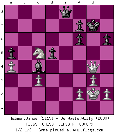 Last move : 1/2-1/2 2011 April 11 10:22:28 [Event "FICGS__CHESS__CLASS_A__000079"] [Site "FICGS"] [Date "2010.10.30"] [Round "1"] [White "Helmer,Janos"] [Black "De Waele,Willy"] [Result "1/2-1/2"] [WhiteElo "2119"] [BlackElo "2000"] 1.c4 Nf6 2.Nc3 e5 3.g3 Bb4 4.Bg2 O-O 5.Nf3 Nc6 6.O-O Bxc3 7.bxc3 Re8 8.d3 e4 9.Nd4 exd3 10.exd3 h6 11.Be3 Ne5 12.c5 d6 13.c6 d5 14.cxb7 Bxb7 15.Re1 c5 16.Nb3 c4 17.Nc5 Bc6 18.Bd4 Qd6 19.Rb1 Rac8 20.Re3 a5 21.Bh3 Rb8 22.Rxb8 Qxb8 23.Bf5 Bb5 24.dxc4 Bxc4 25.a4 Nfg4 26.Bxg4 Nxg4 27.Rxe8+ Qxe8 28.Kg2 Nf6 29.Bxf6 gxf6 30.Qg4+ Kh8 31.Qd4 Kg7 32.Qg4+ 1/2-1/2 English Opening Kingside Castling by player Black (move 4) Kingside Castling by player White (move 6) This chess game ended in a draw. Follow this game move after move (download)War is the child of passion, passion is the child of narcissism and narcissism is the child. (...) Another game ? (Thibault de Vassal) Obwohl ich alt bin, darf mir niemand den Finger in den Mund stecken, sonst beisse ich. (Wilhelm Steinitz) Todavía soy una víctima del Ajedrez. Tiene toda la belleza del arte y mucho mas. No puede ser comercializado. El Ajedrez es mas puro que el arte en su posición social. (Marcel Duchamp) Les échecs sont utiles à l'exercice de la faculté de penser et à celle de l'imagination. Car nous devons posséder une méthode élaborée pour atteindre des buts partout où nous devons conduire notre raison. (Leibnitz) Fortune favours the audacious. (Desiderius Erasmus)