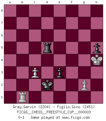 Last move : 0-1 2010 October 30 14:46:50 [Event "FICGS__CHESS__FREESTYLE_CUP__000003"] [Site "FICGS"] [Date "2010.10.30"] [Round "1"] [White "Gray,Garvin"] [Black "Figlio,Gino"] [Result "0-1"] [WhiteElo "2204"] [BlackElo "2451"] 1.e4 c5 2.Nf3 d6 3.d4 cxd4 4.c3 Nf6 5.Qxd4 Nc6 6.Bb5 Bd7 7.Qd3 a6 8.Ba4 g6 9.O-O Bg7 10.Bb3 O-O 11.h3 Rc8 12.Na3 Qc7 13.Rd1 Na5 14.Bg5 Bc6 15.Bxf6 Bxf6 16.Nd4 Bd7 17.Nac2 e6 18.Nf3 Be7 19.Ne3 Bb5 20.Qc2 Rfd8 21.Ng4 Bd7 22.Qe2 h5 23.Ne3 b5 24.Bc2 Nc4 25.Bd3 Nb6 26.Nd4 Qb7 27.Rac1 Na4 28.a3 Bg5 29.Rb1 Nc5 30.Nec2 Bh6 31.Ne3 e5 32.Ndc2 Be6 33.f3 Ba2 34.Ra1 Bb3 35.Nd5 f5 36.Re1 fxe4 37.fxe4 Rf8 38.Nce3 Kg7 39.Kh2 Bf4+ 40.Kg1 Rf7 41.Nxf4 Rxf4 42.Nd5 Bxd5 43.exd5 Qxd5 44.Bc2 Rcf8 45.Rad1 Qc6 46.Qe3 a5 47.Rd2 a4 48.Red1 R8f6 49.Kh2 Qc7 50.Bd3 Nxd3 51.Rxd3 Qc5 52.Qe1 Qf2 53.Rd5 Qxe1 54.Rxe1 Rf2 55.Rxb5 Rc2 56.Rg1 R6f2 57.Rb4 Rxb2 58.Rxa4 Rfc2 59.Rc4 Ra2 60.Rc6 Rd2 61.Ra6 Kf6 62.a4 e4 63.h4 e3 64.Kg3 Ke5 65.Kf3 Rd3 66.Re1 Rf2+ 67.Kg3 Ke4 68.Rc6 Rd5 69.a5 Ra2 70.Rc4+ Kd3 71.Rf4 g5 72.Rf6 gxh4+ 73.Kxh4 Kd2 74.Rb1 R2xa5 75.Re6 Re5 76.Rxd6+ Rad5 77.Rxd5+ Rxd5 0-1 Sicilian Kingside Castling by player White (move 9) Kingside Castling by player Black (move 10) 10 pieces endgame at move 76 : White KRRPP , Black KRRPP WHITE : King + 2 Rooks 2 Pawns BLACK : King + 2 Rooks 2 Pawns 9 pieces endgame at move 77 : White KRRPP , Black KRPP WHITE : King + 2 Rooks 2 Pawns BLACK : King + 1 Rook 2 Pawns 8 pieces endgame at move 77 : White KRPP , Black KRPP WHITE : King + 1 Rook 2 Pawns BLACK : King + 1 Rook 2 Pawns Player Black won this chess game. Follow this game move after move (download)Chess is the gymnasium of the mind. (Blaise Pascal) Das typische an einem Großmeister ist, daß er eine gewonnene Position schnell und schmerzlos gewinnt. (Irving Chernev) Los Peones son nacidos libres, y aún así, se encuentran encadenados por todos lados. (Rick Kennedy) Des idées, des idées, j'en ai cent, j'en ai mille. Des bonnes, des mauvaises, applicables, irréalisables... Il suffit de faire le tri ! (Roos) Be who you are, and say what you feel because those who mind don't matter, and those who matter don't mind. (Dr Seuss)