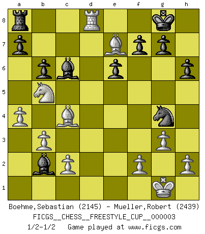 Last move : 1/2-1/2 2010 October 30 13:47:14 [Event "FICGS__CHESS__FREESTYLE_CUP__000003"] [Site "FICGS"] [Date "2010.10.30"] [Round "1"] [White "Boehme,Sebastian"] [Black "Mueller,Robert"] [Result "1/2-1/2"] [WhiteElo "2145"] [BlackElo "2439"] 1.e4 e6 2.d4 d5 3.Nd2 c5 4.exd5 Qxd5 5.Ngf3 cxd4 6.Bc4 Qd6 7.O-O Nf6 8.Nb3 Nc6 9.Nbxd4 Nxd4 10.Nxd4 Be7 11.Nf3 O-O 12.Qxd6 Bxd6 13.Rd1 Bc7 14.b3 b6 15.Ba3 Rd8 16.Be7 Rd7 17.Rxd7 Bxd7 18.Rd1 Bc6 19.Nd4 Bb7 20.Nb5 Be5 21.Re1 Bb2 22.a4 h6 23.g3 Bf3 24.Re3 Bc6 25.Rd3 Ng4 26.Rd8+ 1/2-1/2 French : Tarrasch, Open variation Kingside Castling by player White (move 7) Kingside Castling by player Black (move 11) This chess game ended in a draw. Follow this game move after move (download)Capture of the adverse King is the ultimate but not the first object of the game. (William Steinitz) Die Auseinandersetzung mit Karpow war politisch geprägt. Er stand für das kommunistische System, wurde von dessen Repräsentanten gehätschelt. Ich war der Oppositionelle. Jeder Schachweltmeister spiegelt auch die gesellschaftlichen Verhältnisse wider. Kramnik steht für die Börsen-Generation des Neuen Markts, ideologiefrei, zahlenfixiert. (Garry Kasparov) El jugador táctico debe saber que hacer cuando algo se debe de hacer. El estratégico debe saber que hacer cuando nada se debe de hacer. (Savielly Tartakover) Un journaliste : 'Vous préférez avoir une dame de plus sur l'échiquier ou au lit ?' Boris Spassky : 'Ca dépend de la position.' . 'gn is not allowed in chess unless n is an integer between 1 and 8 inclusive, where 1 and 8 are to interpreted as the standard numerals standing for integers in the ordered real-closed field R, with the *canonical* ordering. (As opposed to, say, an integer in the domain Z[2+i*sqrt(5)] or an integer in some exotic Grothendieck topos). (Normajean Yates)