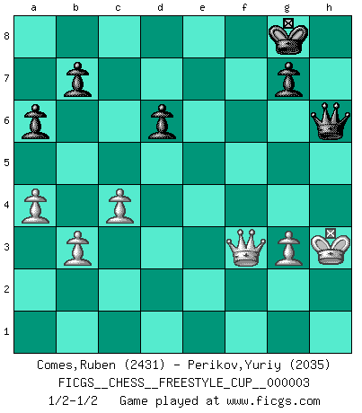 Last move : 1/2-1/2 2010 October 30 14:39:23 [Event "FICGS__CHESS__FREESTYLE_CUP__000003"] [Site "FICGS"] [Date "2010.10.30"] [Round "1"] [White "Comes,Ruben"] [Black "Perikov,Yuriy"] [Result "1/2-1/2"] [WhiteElo "2431"] [BlackElo "2035"] 1.e4 c5 2.Nf3 d6 3.Bb5+ Bd7 4.c4 Nc6 5.d4 cxd4 6.Nxd4 e5 7.Nf3 Nf6 8.Nc3 Be7 9.Bg5 a6 10.Bxc6 Bxc6 11.Bxf6 Bxf6 12.O-O O-O 13.Qe2 Qd7 14.Rfd1 Qe6 15.a4 Be7 16.Nd2 Bh4 17.Qd3 Rac8 18.b3 Qg6 19.Nd5 f5 20.exf5 Rxf5 21.f3 Rcf8 22.Rf1 Bd8 23.Ne4 Rh5 24.Rad1 Kh8 25.Qe3 Bg5 26.Nxg5 Rxg5 27.Rf2 Qh6 28.Qd2 Qh5 29.Rdf1 h6 30.Qd3 Rf7 31.Qe4 Rg6 32.Rd1 Qg5 33.Rfd2 h5 34.Kh1 Rf4 35.Qe2 Rh4 36.Qf2 Kg8 37.Re1 Kh7 38.R2d1 Bd7 39.Kg1 Bc6 40.Rd3 Rh3 41.Kh1 Rh4 42.Rd2 Kg8 43.Kg1 Kh7 44.R2d1 Kh8 45.Re2 Bxd5 46.Rxd5 Qf4 47.g3 Qf7 48.Kf1 Rf6 49.Re3 Rg4 50.Kg2 h4 51.Qd2 R4g6 52.Qd3 hxg3 53.hxg3 Rh6 54.R3xe5 Rxf3 55.Re8+ Qxe8 56.Qxf3 Qe1 57.Rh5 Qd2+ 58.Kh3 Kg8 59.Rxh6 Qxh6+ 1/2-1/2 Sicilian : Canal-Sokolsky attack, 3...Bd7 Kingside Castling by player White (move 12) Kingside Castling by player Black (move 12) This chess game ended in a draw. Follow this game move after move (download)The Chess pieces are the block alphabet which shapes thoughts; and these thoughts, although making a visual design on the chessboard, express their beauty abstractly, like a poem. (Marcel Duchamp) Aljechin war kein Nazi. Er war ein Opportunist. Ein schrecklicher Mann. Er liebte Geld über alles und würde für Geld ein Jude, ein Katolik oder ein Protestant werden. (Miguel Najdorf) Si tu oponente no puede hacer nada activo, entonces no apures la posición; En vez de eso, dejalo estar sentado ahí, sufriendo y rogandote por un empate. (Jeremy Silman) Toutes les manuvres exécutées sur une colonne ouverte ont pour but ultime l'intrusion définitive sur la septième ou la huitième rangée, en plein cur de la position ennemie. (Aaron Nimzovitch) If you are good, you will be assigned all the work. If you are really good, you will get out of it. (Dan Rotaru)