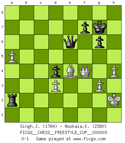 Last move : 0-1 2010 October 30 14:30:49 [Event "FICGS__CHESS__FREESTYLE_CUP__000003"] [Site "FICGS"] [Date "2010.10.30"] [Round "1"] [White "Singh,Jai Prakash"] [Black "Nookala,Kamesh"] [Result "0-1"] [WhiteElo "1784"] [BlackElo "2380"] 1.e4 e5 2.Nf3 Nc6 3.Bb5 a6 4.Ba4 Be7 5.O-O Nf6 6.Nc3 b5 7.Bb3 d6 8.Re1 Bg4 9.h3 Bxf3 10.Qxf3 Nd4 11.Qg3 O-O 12.d3 a5 13.Ne2 a4 14.Nxd4 exd4 15.Bd5 c6 16.Bxc6 Rc8 17.Bb7 Rc7 18.e5 dxe5 19.Bf3 Rxc2 20.Qxe5 Bb4 21.Re2 Bd6 22.Qxb5 Rxe2 23.Bxe2 Re8 24.Bf1 Re1 25.b3 a3 26.Qc6 h5 27.g3 h4 28.Bxa3 Rxa1 29.Bxd6 hxg3 30.fxg3 Nh5 31.a4 Qf6 32.Qe8+ Kh7 33.Qe2 Qxd6 34.Qxh5+ Kg8 35.Qg5 Rb1 36.a5 Rxb3 37.Kh2 g6 38.Qd2 Kg7 39.Bg2 Ra3 40.h4 Qe5 41.Be4 Qe6 42.Qf4 Ra2+ 0-1 This chess game has been lost on time (started : 2010.10.30 13:19:22) Ruy Lopez Kingside Castling by player White (move 5) Kingside Castling by player Black (move 11) Player Black won this chess game. Follow this game move after move (download)Chess is thirty to forty percent psychology. You don't have this when you play a computer. I can't confuse it. (Judith Polgar) Der Verteidiger gebe der Gewalt nach, aber nur der Gewalt. Er schaffe sich nicht freiwillig, etwa aus Blindheit oder aus Schrecken, irgendwelche Schwächen. Er lasse sich nicht bluffen. (Emanuel Lasker) El ganar no lo es todo... pero el perder es nada. (Mednis) Pour moi, les échecs ne sont pas un jeu mais un art. (Alexandre Alekhine) Art is the triumph over chaos. (John Cheever)