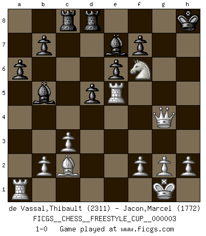 Last move : 1-0 2010 October 30 14:21:1 [Event "FICGS__CHESS__FREESTYLE_CUP__000003"] [Site "FICGS"] [Date "2010.10.30"] [Round "1"] [White "de Vassal,Thibault"] [Black "Jacon,Marcel"] [Result "1-0"] [WhiteElo "2311"] [BlackElo "1772"] 1.e4 c5 2.Nf3 e6 3.Nc3 Nc6 4.Bb5 Nd4 5.O-O Ne7 6.Nxd4 cxd4 7.Ne2 Qb6 8.a4 a6 9.Bd3 Nc6 10.c3 Be7 11.a5 Nxa5 12.Nxd4 O-O 13.Bc2 d6 14.Nf3 Bd7 15.d4 Rac8 16.e5 Bb5 17.Re1 d5 18.Ng5 h6 19.Nh7 Rfd8 20.Qh5 Nc4 21.Bxh6 Nxe5 22.dxe5 Qc7 23.Bxg7 Kxg7 24.Qg4+ Kh8 25.Nf6 Qxe5 26.Rxe5 1-0 Thibault de Vassal Merci pour la partie Marcel. 17...d5 etait le seul coup joue un peu trop rapidement, pas de chance... a la prochaine ! Sicilian defense Kingside Castling by player White (move 5) Kingside Castling by player Black (move 12) Player White won this chess game. Follow this game move after move (download)It is difficult to play against Einstein's theory --on his first loss to Fischer. (Mikhail Tal) Ich verachte Kasparow. (Viktor Kortschnoi) Fischer deseaba darle a los Rusos una sopa de su propia medicina. (Larry Evans) Le génie consiste à savoir transgresser les règles au moment opportun. (Teichmann) The project of the man are lower than those of the sky. (Chinese proverb)