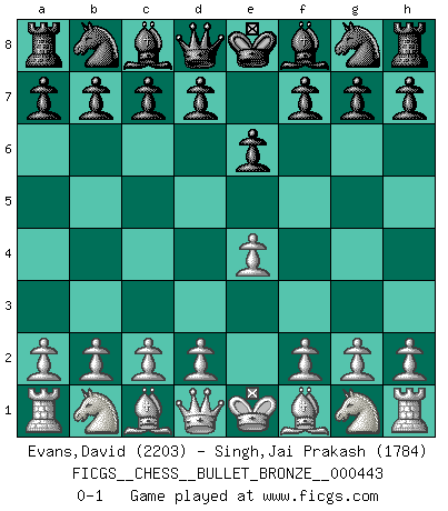 Last move : 0-1 2010 October 30 15:11:59 [Event "FICGS__CHESS__BULLET_BRONZE__000443"] [Site "FICGS"] [Date "2010.10.30"] [Round "1"] [White "Evans,David"] [Black "Singh,Jai Prakash"] [Result "0-1"] [WhiteElo "2203"] [BlackElo "1784"] 1.e4 e6 0-1 French defense Player Black won this chess game. Follow this game move after move (download)Only the player with the initiative has the right to attack. (Wilhelm Steinitz) Es ist im Leben wie im Schachspiel. Wir entwerfen einen Plan, dieser bleibt jedoch bedingt durch das, was im Schachspiel dem Gegner, im Leben dem Schicksal zu tun belieben wird. (Arthur Schopenhauer) El Ajedrez es una hermosa aventura. (Bent Larsen) Même un GMI sait rarement calculer sur plus de cinq coups une attaque à sacrifices. (Rudolf Spielmann) You lose, general Kenobi. (General Grievous in Star Wars ep.3)