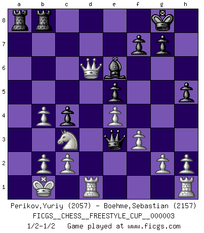Last move : 1/2-1/2 2010 October 30 15:52:24 [Event "FICGS__CHESS__FREESTYLE_CUP__000003"] [Site "FICGS"] [Date "2010.10.30"] [Round "1"] [White "Perikov,Yuriy"] [Black "Boehme,Sebastian"] [Result "1/2-1/2"] [WhiteElo "2057"] [BlackElo "2157"] 1.e4 c5 2.Nf3 d6 3.d4 cxd4 4.Nxd4 Nf6 5.Nc3 a6 6.f3 e5 7.Nb3 Be6 8.Be3 Be7 9.a3 h5 10.Qd2 Nbd7 11.O-O-O b5 12.Kb1 Rc8 13.Nc1 O-O 14.N1a2 Nb6 15.Qf2 Nc4 16.Bg5 Qd7 17.Bxc4 bxc4 18.Nb4 a5 19.Bxf6 axb4 20.Bxe7 Qxe7 21.axb4 Ra8 22.Qb6 Rfb8 23.Qxd6 Qa7 24.Kc1 Qe3+ 25.Kb1 Qa7 26.Kc1 Qe3+ 27.Kb1 1/2-1/2 Sicilian : Najdorf Queenside Castling by player White (move 11) Kingside Castling by player Black (move 13) This chess game ended in a draw. Follow this game move after move (download)Who is your opponent tonight, tonight I am playing against the Black pieces. (Akiba Rubinstein) Zu meiner Zeit war ein 20 jähriger ein junger Spieler, heute ist er ein Veteran. (Garry Kasparov) En partidas rápidas, el Caballo es mas poderoso que el Alfil. (Vlastimil Hort) Les échecs sont plus proches de l'art de l'assassinat que de l'art de la guerre. (Arturo Perez-Reverte) Now the reason the enlightened prince and the wise general conquer the enemy whenever they move and their achievements surpass those of ordinary men is foreknowledge. (Sun Tzu)