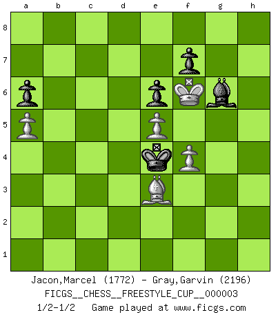 Last move : 1/2-1/2 2010 October 30 16:31:22 [Event "FICGS__CHESS__FREESTYLE_CUP__000003"] [Site "FICGS"] [Date "2010.10.30"] [Round "1"] [White "Jacon,Marcel"] [Black "Gray,Garvin"] [Result "1/2-1/2"] [WhiteElo "1772"] [BlackElo "2196"] 1.e4 e6 2.d4 d5 3.Nc3 Bb4 4.e5 c5 5.a3 Bxc3+ 6.bxc3 Qc7 7.Qg4 Ne7 8.Qxg7 Rg8 9.Qxh7 cxd4 10.Ne2 Nbc6 11.f4 dxc3 12.Qd3 Bd7 13.Qxc3 O-O-O 14.Rb1 Nf5 15.Rg1 d4 16.Qd3 Na5 17.Rb4 a6 18.g4 Ne3 19.Nxd4 Nxg4 20.Qe2 Qc3+ 21.Qd2 Qxd2+ 22.Bxd2 Nxh2 23.Rxg8 Rxg8 24.Bd3 Bc6 25.Be3 Ng4 26.Bc1 Bg2 27.Be2 Nc6 28.Nxc6 Bxc6 29.Rb3 Nh6 30.Be3 Nf5 31.Bb6 Rh8 32.Rd3 Be4 33.Rd1 Ne7 34.c4 Nc6 35.Kf2 Rh2+ 36.Ke3 Bg6 37.Rf1 Ne7 38.Rf2 Nf5+ 39.Kd2 Rh3 40.Rf3 Ng3 41.a4 Kd7 42.a5 Ke7 43.Bc5+ Ke8 44.Bb6 Bf5 45.Re3 Nxe2 46.Rxh3 Bxh3 47.Kxe2 Kf8 48.Ke3 Kg7 49.Kd3 Kg6 50.Be3 Kf5 51.Kd4 Bf1 52.Bc1 Kg4 53.Kc5 Bd3 54.Kb6 Bxc4 55.Kxb7 Kf5 56.Bd2 Bb5 57.Kc7 Be2 58.Kd6 Ke4 59.Ke7 Bh5 60.Kf6 Bg6 61.Bc1 Kf3 62.Bd2 Ke4 63.Bc1 Kd5 64.Be3 Ke4 1/2-1/2 French : Winawer, Classical variation Queenside Castling by player Black (move 13) 10 pieces endgame at move 55 : White KBPPP , Black KBPPP WHITE : King + 1 Bishop 3 Pawns BLACK : King + 1 Bishop 3 Pawns This chess game ended in a draw. Follow this game move after move (download)The only thing Chess players have in common is Chess. (Lodewijk Prins) Frage: Wie viele Autos haben Sie schon zerstört? - Antwort: Nur zwei. (Loek van Wely) Un entendimiento a fondo de las continuaciones típicas del mate, hace de las combinaciones de sacrificio mas complicadas conducirlas a ellas no solo sin dificultad, sino casi de una manera natural. (Siegbert Tarrasch) Plusieurs personnes se sont demandées comment Tal faisait pour gagner... En fait, c'est très simple ! Il met ses pièces au centre de l'échiquier et les sacrifie quelque part ! (David Bronstein) Live, lose, and learn, by observing your opponent how to win. (Amber Steenbock)