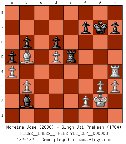 Last move : 1/2-1/2 2010 October 30 16:31:6 [Event "FICGS__CHESS__FREESTYLE_CUP__000003"] [Site "FICGS"] [Date "2010.10.30"] [Round "1"] [White "Moreira,Jose"] [Black "Singh,Jai Prakash"] [Result "1/2-1/2"] [WhiteElo "2096"] [BlackElo "1784"] 1.d4 Nf6 2.c4 e6 3.g3 c5 4.d5 exd5 5.cxd5 g6 6.Nc3 Bg7 7.Nf3 d6 8.Bg2 O-O 9.O-O a6 10.a4 Nbd7 11.Bf4 Qc7 12.e4 Re8 13.Qc2 Ng4 14.Nd2 b6 15.h3 Nge5 16.Be3 c4 17.Ra3 Bb7 18.Ne2 Rac8 19.Nd4 Nc5 20.Rb1 Ncd3 21.Qc3 a5 22.Nb5 Qd8 23.Bd4 g5 24.Rf1 Bh6 25.Na7 Ra8 26.Nxc4 Nxc4 27.Qxc4 Rxa7 28.Qxd3 Ba6 29.Qe3 Bxf1 30.Bxf1 Rb7 31.Bb5 Rf8 32.Bc6 Re7 33.e5 Bg7 34.Qxg5 Rxe5 35.Qxd8 Rxd8 36.Bxe5 Bxe5 37.b3 Rc8 38.Ra2 Rc7 39.Rc2 Kg7 40.Kg2 Re7 41.Rc4 Bb2 42.Rg4+ Kf8 43.Rh4 Kg7 44.Bb5 Re5 45.Rg4+ Kf8 46.Rh4 Kg7 47.Rg4+ Kf8 48.Rh4 Kg7 1/2-1/2 Catalan Opening Kingside Castling by player Black (move 8) Kingside Castling by player White (move 9) This chess game ended in a draw. Follow this game move after move (download)You can only get good at Chess if you love the game. (Bobby Fischer) Schach ist eine Sache der genauen Beurteilung, wann man zuschlagen und wann man sich ducken muss. (Robert James Fischer) Robert Fischer es la ley hacia si mismo. (Larry Evans) Les échecs sont un jeu terrible. Si vous n'avez pas le centre, votre adversaire a une position plus libre. Par contre, si vous avez le centre, alors vous avez vraiment quelque chose pour laquelle vous inquiéter ! (Siegbert Tarrasch) The age of a woman doesn't mean a thing. The best tunes are played on the oldest fiddles. (Ralph Waldo Emerson)