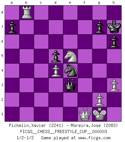 Last move : 1/2-1/2 2010 October 30 18:15:17 [Event "FICGS__CHESS__FREESTYLE_CUP__000003"] [Site "FICGS"] [Date "2010.10.30"] [Round "1"] [White "Pichelin,Xavier"] [Black "Moreira,Jose"] [Result "1/2-1/2"] [WhiteElo "2241"] [BlackElo "2083"] 1.e4 e6 2.d4 d5 3.Nd2 Nf6 4.e5 Nfd7 5.c3 c5 6.Bd3 Nc6 7.Ne2 cxd4 8.cxd4 f6 9.exf6 Nxf6 10.O-O Bd6 11.Nf3 Qb6 12.Bf4 Bxf4 13.Nxf4 O-O 14.Re1 Qxb2 15.Nxe6 Bxe6 16.Rxe6 Rae8 17.Rb1 Qxa2 18.Rxe8 Rxe8 19.Rxb7 Ne4 20.Qf1 h6 21.h3 Qa3 22.Qb1 Kh8 23.Bf1 Rc8 24.Qc2 Ne7 25.Qe2 Rc1 26.Ne5 Nf5 27.Kh2 Nfg3 28.Rb8+ Kh7 29.fxg3 Qxg3+ 30.Kg1 Re1 31.Qf3 Rxf1+ 32.Qxf1 Qe3+ 33.Kh2 Qg3+ 34.Kg1 Qe3+ 1/2-1/2 French : Tarrasch, Closed variation Kingside Castling by player White (move 10) Kingside Castling by player Black (move 13) This chess game ended in a draw. Follow this game move after move (download)Whoever sees no other aim in the game than that of giving checkmate to one's opponent will never become a good Chess player. (Euwe) Darum geht es im Schach. Einen Tag gibst du deinem Gegner eine Lektion, am nächsten Tag gibt er dir eine. (Robert James Fischer) Un Peón pasado es un criminal, quién debe ser mantenido bajo candado y llave. Leves medidas, tales como vigilancia policiaca, no son suficientes. (Aaron Nimzovich) La solitude du joueur d'Echecs à l'approche du mat est semblable à celle du condamné. (Francis Szpiner) Experiences are the keys to life. (Daniel Parmet)