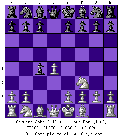 Last move : 1-0 2007 January 9 11:18:30 [Event "FICGS__CHESS__CLASS_D__000020"] [Site "FICGS"] [Date "2006.11.28"] [Round "1"] [White "Caburro,John"] [Black "Lloyd,Dan"] [Result "1-0"] [WhiteElo "1461"] [BlackElo "1400"] 1.d4 d5 2.c4 dxc4 3.Nf3 1-0 This chess game has been lost on time (started : 2006.11.28 3:33:45) QGA : 3.Nf3 Player White won this chess game. Follow this game move after move (download)Man is a frivolous, a specious creature, and like a Chess player, cares more for the process of attaining his goal than for the goal itself. (Dostoyevsky) Wenn Dein Gegner dir ein Remis anbietet, versuch herauszufinden, weshalb er glaubt schlechter zu stehen. (Nigel Short) Un mal día en el Ajedrez, es mejor que cualquier buen día en el trabajo. (Anonymous) A ce moment-là, je menaçais de comprendre la position ! (Clément L'Heureux) In fact if nothing is done against this teddy bear, hereby I announce that I would quit chess, rapid chess, blitz chess, postal chess, email chess, server chess and correspondence chess I will then switch to a table game where teddy bears aren't going to be seen for a while, like Poker, or Roulette, all 18+ games. (Elmer Valderrama)