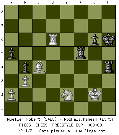 Last move : 1/2-1/2 2010 October 31 14:13:18 [Event "FICGS__CHESS__FREESTYLE_CUP__000003"] [Site "FICGS"] [Date "2010.10.31"] [Round "1"] [White "Mueller,Robert"] [Black "Nookala,Kamesh"] [Result "1/2-1/2"] [WhiteElo "2426"] [BlackElo "2373"] 1.e4 e5 2.Nf3 Nc6 3.Bb5 a6 4.Ba4 Be7 5.O-O Nf6 6.Re1 b5 7.Bb3 d6 8.c3 O-O 9.h3 Nb8 10.d4 Nbd7 11.Nbd2 Bb7 12.Bc2 Re8 13.Nf1 Bf8 14.Ng3 c6 15.Nf5 Qc7 16.Bd2 h6 17.Nh2 exd4 18.cxd4 c5 19.d5 Ne5 20.Nf3 Bc8 21.Ng3 Nc4 22.Bc3 Nd7 23.b3 Na3 24.Bd3 b4 25.Bb2 g6 26.h4 Nb5 27.h5 Ne5 28.Nxe5 dxe5 29.hxg6 fxg6 30.Qd2 Qd8 31.Rac1 Bd7 32.f3 h5 33.Ne2 Qb6 34.Kh1 Nd4 35.Rf1 Bg7 36.f4 Bh6 37.Bxd4 cxd4 38.Qe1 Qd6 39.Qg3 Re7 40.fxe5 Rxe5 41.Rc4 Rae8 42.Qh4 Rg5 43.Qh2 Qe7 44.d6 Qd8 45.Rc7 Rg4 46.Bc4+ Kh8 47.g3 d3 48.Bxd3 Re6 49.e5 Rxe5 50.Rf7 Be6 51.Qf2 Bd5+ 52.Kg1 Bxf7 53.Qxf7 Qg8 54.Qxg8+ Kxg8 55.d7 Bg5 56.Kf2 h4 57.gxh4 Rxh4 58.Bc4+ Kh8 59.Rc8+ Kg7 60.d8Q Bxd8 61.Rxd8 a5 62.Rd7+ Kh6 63.Rd6 Rf5+ 64.Ke3 Re5+ 65.Kf3 Rf5+ 66.Kg2 1/2-1/2 Ruy Lopez Kingside Castling by player White (move 5) Kingside Castling by player Black (move 8) Promotion Queen by player White (move 60) This chess game ended in a draw. Follow this game move after move (download)There are tough players and nice guys, and I'm a tough player. (Bobby Fischer) Wenn du nicht weißt was du tun sollst, warte bis dein Gegner eine Idee hat. Sie wird sicher schlecht sein. (Siegbert Tarrasch) El Ajedrez es parte de una cultura y si una cultura esta en decadencia, entonces también el Ajedrez declinará. (Mikhail Botvinnik) Les échecs, c'est l'art d'analyser. (Mikhail Botvinnik) Your best chance to get a Royal Flush in a casino is in the bathroom. (Anonymous)