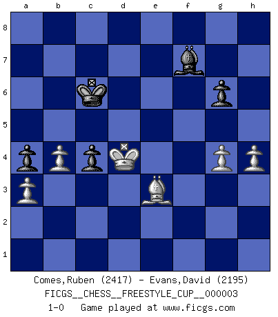 Last move : 1-0 2010 October 31 14:18:5 [Event "FICGS__CHESS__FREESTYLE_CUP__000003"] [Site "FICGS"] [Date "2010.10.31"] [Round "1"] [White "Comes,Ruben"] [Black "Evans,David"] [Result "1-0"] [WhiteElo "2417"] [BlackElo "2195"] 1.e4 c5 2.Nf3 d6 3.c3 Nf6 4.h3 Nc6 5.Qc2 e5 6.Bc4 Be7 7.O-O O-O 8.d3 Na5 9.Nbd2 Bd7 10.a3 Nxc4 11.Nxc4 b5 12.Ne3 a5 13.Re1 Re8 14.b3 a4 15.b4 cxb4 16.cxb4 Rc8 17.Qe2 Bf8 18.Bb2 Nh5 19.h4 Nf4 20.Qd2 Qf6 21.Rac1 Qg6 22.Rxc8 Rxc8 23.g3 Nh5 24.Rc1 Rxc1+ 25.Bxc1 Qe6 26.d4 exd4 27.Qxd4 Nf6 28.Nd2 g6 29.Bb2 Bg7 30.Qc3 Qa2 31.Nd1 h6 32.Kg2 Qe6 33.Qd3 Bc6 34.f3 Bd7 35.Nf2 Nxe4 36.Bxg7 Nxd2 37.Bxh6 Nc4 38.Qd4 Qe5 39.Qxe5 dxe5 40.Ne4 Bc6 41.Nf6+ Kh8 42.Bc1 Kg7 43.Ng4 f5 44.Ne3 Nd6 45.Kf2 Kf7 46.Ke2 Ke6 47.Nd1 Nc4 48.Ne3 e4 49.fxe4 fxe4 50.Nxc4 bxc4 51.g4 Be8 52.Kd2 Bf7 53.Kc3 Kd5 54.Bd2 e3 55.Bxe3 Kc6 56.Kd4 1-0 Sicilian Kingside Castling by player White (move 7) Kingside Castling by player Black (move 7) Player White won this chess game. Follow this game move after move (download)We cannot resist the fascination of sacrifice, since a passion for sacrifices is part of a Chessplayer's nature. (Rudolf Spielman) Wer nie einen Fehler gemacht hat, hat nie etwas Neues ausprobiert. (Albert Einstein) Si pudieramos observar el interior de la cabeza de un jugador de Ajedrez, encontraríamos ahí un mundo lleno de sentimientos, imágenes, ideas, emoción y pasión. (Alfred Binet) Pour moi, les échecs ne sont pas un jeu mais un art. (Alexandre Alekhine) The only thing that matters is the evidence. (Horatio Caine, C.S.I. Miami)