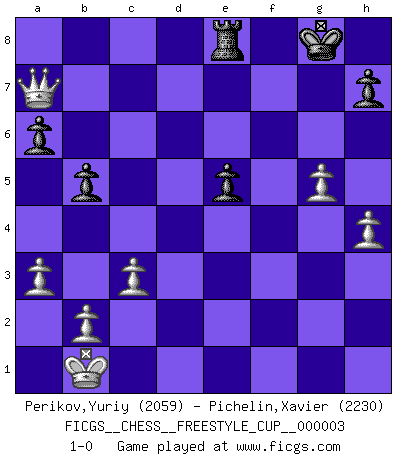 Last move : 1-0 2010 October 31 14:4:17 [Event "FICGS__CHESS__FREESTYLE_CUP__000003"] [Site "FICGS"] [Date "2010.10.31"] [Round "1"] [White "Perikov,Yuriy"] [Black "Pichelin,Xavier"] [Result "1-0"] [WhiteElo "2059"] [BlackElo "2230"] 1.e4 c5 2.Nf3 d6 3.d4 cxd4 4.Nxd4 Nf6 5.Nc3 a6 6.f3 e5 7.Nb3 Be6 8.Be3 Be7 9.a3 O-O 10.Qd2 Nbd7 11.O-O-O b5 12.g4 Nb6 13.Na5 Qc7 14.g5 Nh5 15.h4 Rab8 16.Rh2 g6 17.Kb1 Rfe8 18.Nd5 Nxd5 19.exd5 Bxd5 20.Qxd5 Qxa5 21.Bc4 Rf8 22.Bb3 Qc7 23.Rf2 Ng7 24.f4 Nf5 25.Qe4 Rbc8 26.Rf3 Rfd8 27.fxe5 dxe5 28.Rdf1 Rf8 29.Rxf5 gxf5 30.Rxf5 Bc5 31.Rf6 Kh8 32.c3 Rg8 33.Rxf7 Qxf7 34.Bxf7 Bxe3 35.Bxg8 Kxg8 36.Qxe3 Re8 37.Qa7 1-0 Sicilian : Najdorf Kingside Castling by player Black (move 9) Queenside Castling by player White (move 11) Player White won this chess game. Follow this game move after move (download)In order to improve your game, you must study the endgame before everything else, for whereas the endings can be studied and mastered by themselves, the middle game and the opening must be studied in relation to the endgame. (Jose Raul Capablanca) Ohne Fehler kann es keine Brillanz geben. (Emanuel Lasker) Las leyes del Ajedrez no permiten una libre elección: tienes que mover quieras o no. (Emanuel Lasker) Il n'y a plus de joueurs du niveau de Jacob Murray dont la seule quête est le beau jeu, le plaisir de voir les pièces construire quelque chose. Sur 10 idées à la minute, 9 seront sans intérêt, la dernière s'avèrera géniale. (Christian Bauer) We need strong personalities and only one world champion to attract sponsors. (Anatoly Karpov)