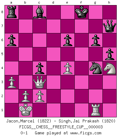 Last move : 0-1 2010 October 31 13:38:30 [Event "FICGS__CHESS__FREESTYLE_CUP__000003"] [Site "FICGS"] [Date "2010.10.31"] [Round "1"] [White "Jacon,Marcel"] [Black "Singh,Jai Prakash"] [Result "0-1"] [WhiteElo "1822"] [BlackElo "1820"] 1.e4 c5 2.Nf3 d6 3.d4 cxd4 4.Nxd4 Nf6 5.Nc3 a6 6.Be2 e6 7.Be3 Qc7 8.Qd2 b5 9.f3 Nbd7 10.a3 Be7 11.O-O-O O-O 12.g4 Nb6 13.g5 Nfd7 14.f4 Re8 15.Rhf1 g6 16.h4 d5 17.Nb3 Nc4 18.Bxc4 dxc4 19.Nd4 b4 20.h5 bxc3 21.Qxc3 gxh5 22.f5 Bd6 23.fxe6 fxe6 24.Nf3 Rf8 25.g6 hxg6 26.Rg1 Bg3 27.Nh4 Ne5 28.Bb6 Bf4+ 29.Kb1 Qh7 30.Be3 Ng4 31.Bxf4 Rxf4 32.Rd8+ Rf8 33.Rxf8+ Kxf8 0-1 Sicilian : Najdorf, Opovcensky variation Queenside Castling by player White (move 11) Kingside Castling by player Black (move 11) Player Black won this chess game. Follow this game move after move (download)The battle for the ultimate truth will never be won. And that's why Chess is so fascinating. (Hans Kmoch) Bobby Fischer ist kein Vorbild für die heutige Jugend. (Viktor Kortschnoi) No todos los artistas son jugadores de Ajedrez, pero todos los jugadores de Ajedrez son artistas. (Marcel Duchamp) Si rien de grave n'est détecté lors de l'analyse d'une position, on joue alors le coup. Seconde règle de Blumenfeld. Unless I accept my faults I will most certainly doubt my virtues. (Hugh Prather)