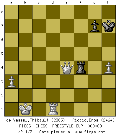 Last move : 1/2-1/2 2010 October 31 13:45:26 [Event "FICGS__CHESS__FREESTYLE_CUP__000003"] [Site "FICGS"] [Date "2010.10.31"] [Round "1"] [White "de Vassal,Thibault"] [Black "Riccio,Eros"] [Result "1/2-1/2"] [WhiteElo "2365"] [BlackElo "2464"] 1.e4 c5 2.Nf3 d6 3.d4 cxd4 4.Nxd4 Nf6 5.Nc3 a6 6.Be3 e5 7.Nb3 Be6 8.f3 Be7 9.Qd2 O-O 10.O-O-O Nbd7 11.g4 b5 12.g5 b4 13.Ne2 Ne8 14.f4 a5 15.f5 a4 16.Nbd4 exd4 17.Nxd4 b3 18.Kb1 bxc2+ 19.Nxc2 Bb3 20.axb3 axb3 21.Na3 Ne5 22.h4 Ra4 23.Bd4 Nf3 24.Qc3 Nxd4 25.Rxd4 Rxd4 26.Qxd4 d5 27.Qxd5 Qb6 28.Bc4 Bxa3 29.bxa3 Nd6 30.g6 hxg6 31.fxg6 Nxc4 32.gxf7+ Rxf7 33.Qxc4 Qf2 34.Qxb3 Kh7 35.Rd1 Rf4 36.Qd5 Qf3 37.Qd3 Qxe4 38.Qxe4+ 1/2-1/2 Sicilian : Najdorf, Byrne (English) attack Kingside Castling by player Black (move 9) Queenside Castling by player White (move 10) 10 pieces endgame at move 34 : White KQRPPP , Black KQRP WHITE : King + 1 Queen 1 Rook 3 Pawns BLACK : King + 1 Queen 1 Rook 1 Pawn 9 pieces endgame at move 37 : White KQRPP , Black KQRP WHITE : King + 1 Queen 1 Rook 2 Pawns BLACK : King + 1 Queen 1 Rook 1 Pawn 8 pieces endgame at move 38 : White KQRPP , Black KRP WHITE : King + 1 Queen 1 Rook 2 Pawns BLACK : King + 1 Rook 1 Pawn This chess game ended in a draw. Follow this game move after move (download)A passed Pawn increases in strength as the number of pieces on the board diminishes. (Capablanca) Obwohl ich vom Stil her kaum zu den Priestern der Schachkunst gezählt werde, halte ich Schach doch für eine Kunst. (Tigran Petrosjan) Durante una competencia de Ajedrez, un Maestro de Ajedrez deberá ser una combinación de presa de caza y un Monge. (Alexander Alekhine) J'ai vu le vaincu d'Echecs jouer des années durant dans l'espoir de la fête de la victoire. Car tu es plus riche de ce qu'elle existe si même elle n'est point pour toi. Ainsi de la perle du fond des mers. (Antoine de Saint-Exupéry) The real danger is not that computers will begin to think like men, but that men will begin to think like computers. (Sydney J. Harris)
