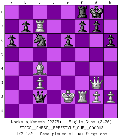 Last move : 1/2-1/2 2010 October 31 15:30:6 [Event "FICGS__CHESS__FREESTYLE_CUP__000003"] [Site "FICGS"] [Date "2010.10.31"] [Round "1"] [White "Nookala,Kamesh"] [Black "Figlio,Gino"] [Result "1/2-1/2"] [WhiteElo "2378"] [BlackElo "2426"] 1.e4 c5 2.Nf3 d6 3.d4 cxd4 4.Nxd4 Nf6 5.Nc3 a6 6.Bg5 e6 7.f4 Qb6 8.Qd2 Qxb2 9.Rb1 Qa3 10.e5 dxe5 11.fxe5 Nfd7 12.Ne4 h6 13.Bh4 Qxa2 14.Rd1 Qd5 15.Qe3 Qxe5 16.Be2 Bc5 17.Bg3 Bxd4 18.Rxd4 Qa5+ 19.Rd2 O-O 20.Bd6 Rd8 21.Qg3 Nc6 22.Bc7 Qb4 23.Nd6 Rf8 24.c3 Qb1+ 25.Rd1 Qb2 26.Rf1 Nc5 27.Rf2 Qa3 28.Bc4 Nd7 29.Nxc8 Raxc8 30.Rxd7 Rxc7 31.Rxc7 Qc1+ 32.Ke2 Qc2+ 1/2-1/2 Sicilian : Najdorf, 7...Qb6 Kingside Castling by player Black (move 19) This chess game ended in a draw. Follow this game move after move (download)Of all my Russian books, the defense contains and diffuses the greatest 'warmth' which may seem odd seeing how supremely abstract Chess is supposed to be. (Vladimir Nabokov) Nur ein wirklich starker Spieler weiß wie schwach er spielt. (Savielly Grigorievitsch Tartakower) Todos los jugadores de Ajedrez deberían tener un pasatiempo. (Savielly Tartakower) Les Echecs mettent en conflit, non pas deux intelligences, mais deux volontés. (Lasker) The leaves of memory seemed to make a mournful rustling in the dark. (Henry Wadsworth Longfellow)