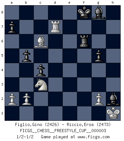 Last move : 1/2-1/2 2010 October 31 18:2:55 [Event "FICGS__CHESS__FREESTYLE_CUP__000003"] [Site "FICGS"] [Date "2010.10.31"] [Round "1"] [White "Figlio,Gino"] [Black "Riccio,Eros"] [Result "1/2-1/2"] [WhiteElo "2426"] [BlackElo "2473"] 1.Nf3 d5 2.c4 c6 3.d4 Nf6 4.Nc3 e6 5.Bg5 h6 6.Bh4 dxc4 7.e4 g5 8.Bg3 b5 9.Be2 Bb7 10.Ne5 Nbd7 11.O-O Be7 12.f4 O-O 13.Nxd7 Qxd7 14.fxg5 hxg5 15.Qd2 Ne8 16.Qe3 f5 17.Be5 Nd6 18.Rad1 Nf7 19.Qh3 Nxe5 20.dxe5 Qc7 21.exf5 Qxe5 22.Bg4 Rad8 23.Rde1 Qd4+ 24.Kh1 Bc8 25.fxe6 Qd3 26.Bf3 Rd6 27.Rd1 Qe3 28.Rxd6 Bxd6 29.Qh6 Qe5 30.Rd1 Rf6 31.Qh5 Kg7 32.Be4 Bxe6 33.Qh7+ Kf8 34.Bxc6 Bg8 35.Qh8 Qxh2+ 36.Qxh2 Bxh2 37.Rd8+ Kg7 38.Rd7+ Kf8 1/2-1/2 Reti Opening Kingside Castling by player White (move 11) Kingside Castling by player Black (move 12) This chess game ended in a draw. Follow this game move after move (download)Weak points or holes in the opponent's position must be occupied by pieces not Pawns. (Siegbert Tarrasch) Jeder weiß, dass Gasprom Putins persönliches Machtinstrument ist. Die Firma wird vom Kreml aus geleitet und wird schon deshalb nie transparent sein. (Garry Kasparov) En partidas rápidas, el Caballo es mas poderoso que el Alfil. (Vlastimil Hort) Votre seul travail dans les ouvertures est d'obtenir un milieu de partie jouable. (Lajos Portish) Some people are so afraid to die that they never begin to live. (Henry Van Dyke)