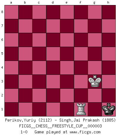 Last move : 1-0 2010 October 31 18:10:6 [Event "FICGS__CHESS__FREESTYLE_CUP__000003"] [Site "FICGS"] [Date "2010.10.31"] [Round "1"] [White "Perikov,Yuriy"] [Black "Singh,Jai Prakash"] [Result "1-0"] [WhiteElo "2112"] [BlackElo "1885"] 1.e4 c5 2.Nf3 d6 3.d4 cxd4 4.Nxd4 Nf6 5.Nc3 a6 6.f3 e5 7.Nb3 Be6 8.Be3 Be7 9.a3 Nbd7 10.Qd2 b5 11.g4 h6 12.O-O-O Qc7 13.Nd5 Bxd5 14.exd5 Nb6 15.Bxb6 Qxb6 16.h4 a5 17.Kb1 Kf8 18.Rh2 Kg8 19.Rg2 Ra7 20.f4 a4 21.Nc1 b4 22.axb4 a3 23.fxe5 axb2 24.Nb3 dxe5 25.c3 Rd7 26.Bc4 Rc7 27.Qe2 Bxb4 28.g5 hxg5 29.hxg5 Ne8 30.Qxe5 Rxc4 31.Qxe8+ Bf8 32.g6 Rf4 33.gxf7+ Rxf7 34.Qe6 Qxe6 35.dxe6 Re7 36.Re2 Re8 37.Kxb2 g5 38.Nd4 Rh6 39.Rg1 Rg6 40.Kb3 Bc5 41.Rge1 g4 42.Kc4 Rc8 43.Kd5 Ba3 44.e7 Rg5+ 45.Ke6 Bxe7 46.Kxe7 Rxc3 47.Kf6 Rg7 48.Re8+ Kh7 49.R8e7 Rxe7 50.Rxe7+ Kg8 51.Rg7+ Kh8 52.Rxg4 Rh3 53.Nf5 Rf3 54.Rd4 Rf2 55.Kg6 Rg2+ 56.Kf7 Rh2 57.Rf4 Kh7 58.Ne7 Kh6 59.Rf5 Rg2 60.Ng8+ Rxg8 61.Kxg8 Kg6 62.Rf7 Kg5 63.Kh7 Kh4 64.Kg6 Kh3 65.Kf5 Kg3 66.Kg5 Kh3 67.Kf4 Kg2 68.Kg4 Kh1 69.Rf2 Kg1 70.Kg3 Kh1 71.Rf1+ 1-0 Sicilian : Najdorf Queenside Castling by player White (move 12) 10 pieces endgame at move 45 : White KRRNP , Black KRRBP WHITE : King + 2 Rooks 1 Knight 1 Pawn BLACK : King + 2 Rooks 1 Bishop 1 Pawn 9 pieces endgame at move 46 : White KRRNP , Black KRRP WHITE : King + 2 Rooks 1 Knight 1 Pawn BLACK : King + 2 Rooks 1 Pawn 8 pieces endgame at move 46 : White KRRN , Black KRRP WHITE : King + 2 Rooks 1 Knight BLACK : King + 2 Rooks 1 Pawn 7 pieces endgame at move 49 : White KRN , Black KRRP WHITE : King + 1 Rook 1 Knight BLACK : King + 2 Rooks 1 Pawn 6 pieces endgame at move 50 : White KRN , Black KRP WHITE : King + 1 Rook 1 Knight BLACK : King + 1 Rook 1 Pawn 5 pieces endgame at move 52 : White KRN , Black KR WHITE : King + 1 Rook 1 Knight BLACK : King + 1 Rook 4 pieces endgame at move 60 : White KR , Black KR WHITE : King + 1 Rook BLACK : King + 1 Rook 3 pieces endgame at move 61 : White KR , Black K WHITE : King + 1 Rook BLACK : King + Player White won this chess game. Follow this game move after move (download)I believe that Chess possesses a magic that is also a help in advanced age. A rheumatic knee is forgotten during a game of Chess and other events can seem quite unimportant in comparison with a catastrophe on the chessboard. (Vlastimil Hort) Je mehr wir mit Computern analysieren, desto mehr glauben wir an Verteidigung. (Vladimir Kramnik) El muchacho (en ese entonces un niño de 12 años llamado Anatoly Karpov) no tiene ni idea de lo que es el Ajedrez y no hay futuro en absoluto para el en esta profesión. (Mikhail Botvinnik) Les Echecs sont et restent toujours un combat, un combat intégral comme la boxe, la lutte ou un autre sport, et où il doit y avoir un vainqueur et un vaincu. (Joseph Emil Diemer) CHESS, n. f. [echecs, Fr.] A nice and abstruse game, in which two sets of puppets are moved in opposition to each other. (Dr Samuel Johnson, A Dictionary Of The English Language, 1755)
