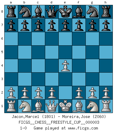 Last move : 1-0 2010 October 31 21:42:19 [Event "FICGS__CHESS__FREESTYLE_CUP__000003"] [Site "FICGS"] [Date "2010.10.31"] [Round "1"] [White "Jacon,Marcel"] [Black "Moreira,Jose"] [Result "1-0"] [WhiteElo "1801"] [BlackElo "2060"] 1.e4 1-0 This chess game has been lost on time (started : 2010.10.31 17:9:0) King's pawn Opening Player White won this chess game. Follow this game move after move (download)Modern Chess is too much concerned with things like Pawn structure. Forget it, Checkmate ends the game. (Nigel Short) Schachspieler können ausgezeichnet Varianten am Schachbrett berechnen, aber nicht im realen Leben. Zu stark ist der Individualismus im Schach ausgeprägt, und für viele ist ein kleiner momentaner persönlicher Vorteil wichtiger als ein weit größerer Vorteil von morgen. (Anatoly Karpov) Durante una competencia de Ajedrez, un Maestro de Ajedrez deberá ser una combinación de presa de caza y un Monge. (Alexander Alekhine) Les Echecs, c'est l'art de la guerre sans les charniers, c'est la résurrection des morts tombés au champ d'honneur, l'espoir perpétuel, la suprématie de l'intelligence sur la force, la culture de l'esprit. (F. Szpiner) Perception is reality. (Immanuel Kant)