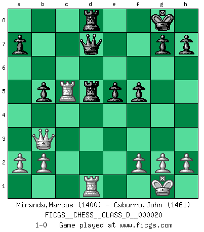 Last move : 1-0 2007 January 16 2:33:27 [Event "FICGS__CHESS__CLASS_D__000020"] [Site "FICGS"] [Date "2006.11.28"] [Round "1"] [White "Miranda,Marcus"] [Black "Caburro,John"] [Result "1-0"] [WhiteElo "1400"] [BlackElo "1461"] 1.e4 Nf6 2.e5 Nd5 3.d4 d6 4.Nf3 Bg4 5.Be2 e6 6.O-O Be7 7.c4 Nb6 8.Nc3 O-O 9.Be3 Nc6 10.exd6 cxd6 11.d5 exd5 12.Nxd5 Nxd5 13.cxd5 Ne5 14.Nxe5 Bxe2 15.Qxe2 dxe5 16.Rfd1 Bd6 17.Qb5 Qe7 18.Rac1 f5 19.Bc5 Rfd8 20.Bxd6 Rxd6 21.Qa5 b6 22.Qa6 Qd7 23.Qd3 Rd8 24.Qc4 b5 25.Qb3 Rxd5 26.Rc5 1-0 Alekhine's defense : Modern variation, 4...Bg4 Kingside Castling by player White (move 6) Kingside Castling by player Black (move 8) Player White won this chess game. Follow this game move after move (download)The isolated Pawn casts gloom over the entire chessboard. (Aaron Nimzovich) Spielt Blackmar-Diemer-Gambit, und das Matt kommt von selbst! (Emil Joseph Diemer) Evita las multitudes. Haz independientemente tu propio razonamiento. Trata de ser el jugador de Ajedrez, no la pieza de Ajedrez. (Ralph Charell) Il n'y a pas eu de défaite parce que je ne crois pas que cet ordinateur ait jamais existé. IBM a triché en refusant d'imprimer les modes de recherche de la machine. C'est évident, pendant le match, des coups décisifs ont été joués par des êtres humains. Aujourd'hui, les meilleurs spécialistes en informatique ne peuvent toujours pas expliquer comment Deep-Blue a pu jouer contre la logique des ordinateurs. IBM a gagné une guerre de communication, mais ils sont incapables de prouver que l'ordinateur a gagné tout seul. (Garry Kasparov) I believe in luck. How else can you explain the success of those you dislike ? (Jean Cocteau)