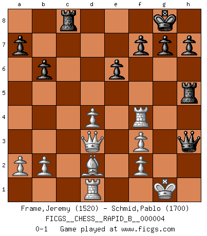 Last move : 0-1 2006 June 9 2:20:8 [Event "FICGS__CHESS__RAPID_B__000004"] [Site "FICGS"] [Date "2006.04.30"] [Round "1"] [White "Frame,Jeremy"] [Black "Schmid,Pablo"] [Result "0-1"] [WhiteElo "1520"] [BlackElo "1700"] 1.e4 c5 2.Nf3 e6 3.c3 Nf6 4.e5 Nd5 5.d4 cxd4 6.cxd4 b6 7.Bd2 Bb7 8.Nc3 Nxc3 9.Bxc3 Bd5 10.Bd3 Nc6 11.O-O d6 12.Re1 Be7 13.Bb5 O-O 14.Qa4 Rc8 15.Bxc6 Bxc6 16.Qc2 Bxf3 17.gxf3 Bg5 18.Qd3 dxe5 19.Rxe5 Qf6 20.Rae1 Qh6 21.R5e4 Bf4 22.h3 Rfd8 23.Rd1 Rd5 24.Bd2 Qxh3 25.Rxf4 Rh5 0-1 Sicilian defense Kingside Castling by player White (move 11) Kingside Castling by player Black (move 13) Player Black won this chess game. Follow this game move after move (download)Bobby is the finest Chess player this country ever produced. His memory for the moves, his brilliance in dreaming up combinations, and his fierce determination to win are uncanny. (John Collins) Die Fehler sind da, Sie warten nur darauf gemacht zu werden. (Savielly Grigorievitsch Tartakower) Yo he agregado estos principios a la ley: pongan los Caballos en acción antes de que los dos Alfiles sean desarrollados. (Emanuel Lasker) Les Echecs ne sont pas pour les âmes timides. Ils requièrent un homme entier, qui ne s'arrête pas aveuglément à ce qui a été déjà établi, mais qui tente individuellement de sonder les profondeurs du jeu. (W. Steinitz) At last I discovered the true beauty of chess. So I proposed to her. (Dinesh De Silva)