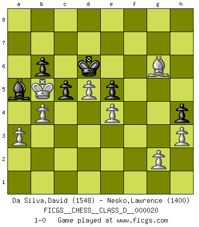 Last move : 1-0 2006 December 27 16:10:3 [Event "FICGS__CHESS__CLASS_D__000020"] [Site "FICGS"] [Date "2006.11.28"] [Round "1"] [White "Da Silva,David"] [Black "Nesko,Lawrence"] [Result "1-0"] [WhiteElo "1548"] [BlackElo "1400"] 1.c4 Nf6 2.Nc3 g6 3.Nf3 Bg7 4.e4 d6 5.d4 O-O 6.Be2 b6 7.O-O Bb7 8.Qc2 Nbd7 9.Rd1 c5 10.d5 Ne5 11.Nxe5 dxe5 12.Bg5 a6 13.a3 Qd6 14.Rab1 e6 15.Bxf6 Bxf6 16.dxe6 Qxe6 17.Nd5 Bxd5 18.Rxd5 Rad8 19.Rbd1 Rxd5 20.Rxd5 Rd8 21.Qd3 Rxd5 22.cxd5 Qc8 23.Qxa6 Qxa6 24.Bxa6 Kf8 25.Kf1 Ke7 26.Bb5 Kd6 27.Ke2 Bg5 28.b3 f5 29.f3 h5 30.Be8 fxe4 31.fxe4 Bf4 32.h3 h4 33.Bxg6 Bg3 34.Kd3 Bf4 35.Kc4 Bd2 36.Kb5 Ba5 37.b4 1-0 English Opening Kingside Castling by player Black (move 5) Kingside Castling by player White (move 7) Player White won this chess game. Follow this game move after move (download)First-class players lose to second class players because second-class players sometimes play a first-class game. (Tarrasch) Ich bin Weltmeister und muß mit niemandem irgend etwas diskutieren. (Viswanathan Anand) Por esta medida (el intervalo entre Fischer y sus contemporaneos), yo le considero el mas grande campeón mundial. (Garry Kasparov) Nous vivons dans un monde échiquéen : chaque jour qui passe est un défi à relever. (Philosophe Sasha) Art is not a thing, it is a way. (Elbert Hubbard)