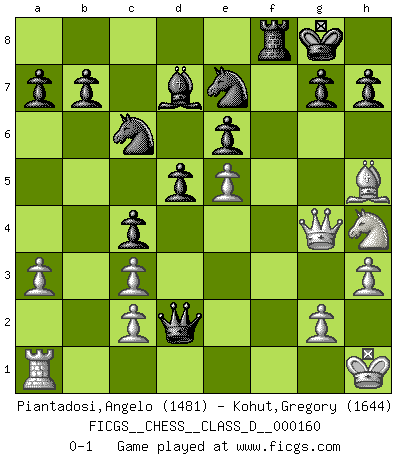 Last move : 0-1 2011 March 3 23:53:1 [Event "FICGS__CHESS__CLASS_D__000160"] [Site "FICGS"] [Date "2010.11.01"] [Round "1"] [White "Piantadosi,Angelo"] [Black "Kohut,Gregory"] [Result "0-1"] [WhiteElo "1481"] [BlackElo "1644"] 1.e4 e6 2.d4 d5 3.Nc3 Bb4 4.e5 c5 5.a3 Bxc3+ 6.bxc3 Ne7 7.Bd3 Nbc6 8.Nf3 Qa5 9.Bd2 c4 10.Be2 Bd7 11.O-O O-O 12.Nh4 f6 13.f4 fxe5 14.fxe5 Rxf1+ 15.Qxf1 Nxd4 16.Bh5 Rf8 17.Qd1 Ndc6 18.Qg4 Qc5+ 19.Kh1 Qf2 20.h3 Qxd2 0-1 French : Winawer, Advance, 6...Ne7 Kingside Castling by player White (move 11) Kingside Castling by player Black (move 11) Player Black won this chess game. Follow this game move after move (download)I like the moment when I break a man's ego. (Bobby Fischer) Ich habe Putins Aufstieg an die Macht beobachtet und seine Politik, die demokratischen Institutionen meines Landes zu zerstören. (Garry Kasparov) El Ajedrez es un mar en el cual un mosquito puede beber y un elefante puede bañarse. (Refrán Hindú) Je menace de comprendre la position. (Anonyme) Excelling at chess has long been considered a symbol of more general intelligence. That is an incorrect assumption in my view, as pleasant as it might be. But for the purposes of argument and investigation, chess is, in Russkin-Gutman's words, 'an unparalleled laboratory, since both the learning process and the degree of ability obtained can be objectified and quantified, providing an excellent comparative framework on which to use rigorous analytical techniques.' (The Chess Master and the Computer, by Garry Kasparov - 2010)