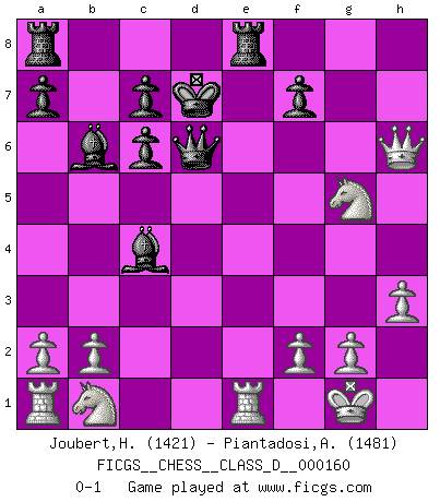 Last move : 0-1 2010 November 24 7:2:57 [Event "FICGS__CHESS__CLASS_D__000160"] [Site "FICGS"] [Date "2010.11.01"] [Round "1"] [White "Joubert,Hennie"] [Black "Piantadosi,Angelo"] [Result "0-1"] [WhiteElo "1421"] [BlackElo "1481"] 1.e4 e5 2.Nf3 Nc6 3.Bc4 Bc5 4.d4 exd4 5.c3 Nf6 6.e5 Ng4 7.O-O O-O 8.cxd4 Bb6 9.h3 Nh6 10.Bxh6 gxh6 11.d5 Re8 12.dxc6 bxc6 13.Qd2 d6 14.Qxh6 Be6 15.Ng5 Bxc4 16.Qxh7+ Kf8 17.Qh6+ Ke7 18.exd6+ Qxd6 19.Re1+ Kd7 0-1 Giuoco Piano Kingside Castling by player White (move 7) Kingside Castling by player Black (move 7) Player Black won this chess game. Follow this game move after move (download)All I want to do, ever, is just play Chess. (Bobby Fischer) Als er Schachweltmeister wurde ließ er praktisch alle stärksten Sovietspieler für sich arbeiten. Wenn ein auch nur mittelmässiger Meister ein Spezialist für eine bestimmte Eröffnung war, wurde er von Karpov gerufen. Das wurde alles geheim gehalten. (Mikhail Moiseyevich Botvinik) El ganador de una partida es aquel jugador que hace el penúltimo error. (Savielly Tartakover) La menace est plus forte que l'exécution. (Aaron Nimzovitch) Macintosh - we might not get everything right, but at least we knew the century was going to end. (Douglas Adams)