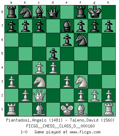Last move : 1-0 2011 March 15 12:21:45 [Event "FICGS__CHESS__CLASS_D__000160"] [Site "FICGS"] [Date "2010.11.01"] [Round "1"] [White "Piantadosi,Angelo"] [Black "Taleno,David"] [Result "1-0"] [WhiteElo "1481"] [BlackElo "1560"] 1.d4 Nf6 2.c4 e6 3.Nc3 Bb4 4.Qc2 O-O 5.a3 Be7 6.Nf3 d5 7.e3 1-0 This chess game has been lost on time (started : 2010.11.01 14:19:35) Nimzo-Indian : Classical variation Kingside Castling by player Black (move 4) Player White won this chess game. Follow this game move after move (download)The passed Pawn is a criminal, who should be kept under lock and key. Mild measures, such as police surveillance, are not sufficient. (Aaron Nimzovich) Der vorletzte Fehler gewinnt. (Savielly Grigorievitsch Tartakower) Debemos de asegurarnos de que el Ajedrez no se convierta en un lenguaje muerto, muy interesante, pero solo para un grupo muy pequeño. (Sytze Faber) Le joueur d'Echecs qui veut atteindre le top est obligé de développer son propre credo créatif. Alexeï Stepanovicth Souétine. Il est facile d'écrire des livres ! Ce qui est difficile, c'est de jouer ! (Alexeï Stepanovicth Souétine) Knowledge will give you power, but character respect. (Bruce Lee)