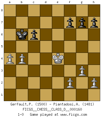 Last move : 1-0 2011 January 2 15:16:17 [Event "FICGS__CHESS__CLASS_D__000160"] [Site "FICGS"] [Date "2010.11.01"] [Round "1"] [White "Gerfault,Pascal"] [Black "Piantadosi,Angelo"] [Result "1-0"] [WhiteElo "1500"] [BlackElo "1481"] 1.e4 e5 2.Nf3 Nc6 3.d4 exd4 4.Nxd4 Nf6 5.Nxc6 bxc6 6.e5 Nd5 7.c4 Nb6 8.Bd3 Bb4+ 9.Bd2 Bxd2+ 10.Qxd2 d5 11.exd6 cxd6 12.O-O O-O 13.Nc3 Ba6 14.b3 d5 15.cxd5 Bxd3 16.Qxd3 Nxd5 17.Rfd1 Nxc3 18.Qxc3 Qb6 19.Rd6 Rac8 20.Rc1 Rfd8 21.Rxd8+ Rxd8 22.g3 Rc8 23.Qc5 Qxc5 24.Rxc5 Kf8 25.Kg2 Ke7 26.Kf3 Kd6 27.b4 Rb8 28.a3 a5 29.Rxa5 Kc7 30.Ra7+ Rb7 31.Rxb7+ Kxb7 32.Ke4 Kb6 33.a4 1-0 Scotch : Mieses variation Kingside Castling by player White (move 12) Kingside Castling by player Black (move 12) Player White won this chess game. Follow this game move after move (download)The defensive power of a pinned piece is only imaginary. (Aaron Nimzovich) Früher wurde jeder komplizierte Zug, jedes interessante Opfer mit großem Beifall und Enthusiasmus aufgenommen. Heute schaltet man einfach seinen Fritz an, und man kann sehen, was los ist, ob der Zug geht oder nicht. (Vladimir Kramnik) Jugadores de primera clase pierden en contra de jugadores de segunda clase porque los jugadores de segunda clase a veces juegan una partida de primer clase. (Siegbert Tarrasch) Plusieurs personnes se sont demandées comment Tal faisait pour gagner... En fait, c'est très simple ! Il met ses pièces au centre de l'échiquier et les sacrifie quelque part ! (David Bronstein) To err is human, but to really foul things up requires a computer. (Farmer's Almanac, 1978)