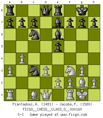 Last move : 0-1 2010 November 14 0:44:27 [Event "FICGS__CHESS__CLASS_D__000160"] [Site "FICGS"] [Date "2010.11.01"] [Round "1"] [White "Piantadosi,Angelo"] [Black "Jacobs,Francois"] [Result "0-1"] [WhiteElo "1481"] [BlackElo "1580"] 1.c4 e5 2.Nc3 Nf6 3.d3 Nc6 4.g3 Be7 5.Bg2 O-O 6.Nf3 Re8 7.a3 d5 8.cxd5 Nxd5 9.O-O Be6 10.b4 Nxc3 0-1 English Opening Kingside Castling by player Black (move 5) Kingside Castling by player White (move 9) Player Black won this chess game. Follow this game move after move (download)You can only get good at Chess if you love the game. (Bobby Fischer) Computer sind die einzigen Gegner, die nicht immer eine Ausrede auf Lager haben, wenn sie gegen mich verlieren. (Robert James Fischer) Yo no le temo a Spassky. Todos saben que yo soy el mejor. Uno no necesita un torneo para probarlo. (Bobby Fischer) Echiquier : carré parfait, comme la Jérusalem nouvelle décrite par l'auteur de l'Apocalypse, huit cases sur huit, exaltation du chiffre 4, symbole du cosmos aux quatre horizons... où le noir et le blanc, l'ombre et la lumière, le mal et le bien s'entremêlent et se conjuguent. (Robert Couffignal, Le Gambit du poète) All the biggest technological inventions created by man - the airplane, the automobile, the computer - says little about his intelligence, but speaks volumes about his laziness. (Mark Kennedy)