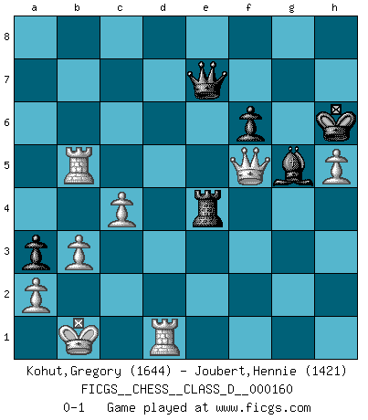 Last move : 0-1 2011 August 30 10:8:13 [Event "FICGS__CHESS__CLASS_D__000160"] [Site "FICGS"] [Date "2010.11.01"] [Round "1"] [White "Kohut,Gregory"] [Black "Joubert,Hennie"] [Result "0-1"] [WhiteElo "1644"] [BlackElo "1421"] 1.e4 c5 2.Nf3 e6 3.d4 cxd4 4.Nxd4 Nf6 5.Nc3 d6 6.Bg5 a6 7.f4 Be7 8.Qf3 Nbd7 9.O-O-O O-O 10.g4 h6 11.Bh4 Qe8 12.Bxf6 Bxf6 13.h4 Be7 14.g5 Qd8 15.gxh6 g6 16.h5 g5 17.Kb1 gxf4 18.Qg2+ Bg5 19.Rg1 f6 20.Nxe6 Qe7 21.Nxf8 Qxf8 22.Bc4+ Kh7 23.Qd2 Ne5 24.Qd5 Nxc4 25.Qxc4 Qe7 26.Qd5 Be6 27.Qxd6 Qf7 28.Rdf1 Kxh6 29.b3 Rc8 30.Ne2 Rc6 31.Qd3 a5 32.Nxf4 a4 33.Nxe6 Qxe6 34.Qe2 a3 35.Rf5 Qd6 36.Rd5 Qb4 37.c4 Qc3 38.Rd3 Qe5 39.Rf1 Qa5 40.Rf5 Qb6 41.Rg3 Qc7 42.Rg1 b5 43.Rxb5 Qa7 44.Rd1 Re6 45.Qf3 Qe7 46.Qf5 Rxe4 0-1 This chess game has been lost on time (started : 2010.11.01 14:19:35) Sicilian : Anderssen variation Queenside Castling by player White (move 9) Kingside Castling by player Black (move 9) Player Black won this chess game. Follow this game move after move (download)Some sacrifices are sound; the rest are mine. (Mikhail Tal) Ein unbeabsichtigtes Patt ist der Gipfel der Dummheit. (Anonymous) El poder defensivo de una pieza clavada, solamente es imaginario. (Aaron Nimzovich) Il a essayé de se convaincre qu'il pourrait empêcher toutes les erreurs et ne jamais perdre. L'horreur ! Gary Kasparov au sujet de Robert Fischer. I teach you to lie, cheat and steal, and as soon as my back's turned you wait in line ? (Gregory House, House M.D.)