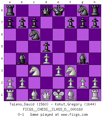 Last move : 0-1 2011 March 15 12:21:45 [Event "FICGS__CHESS__CLASS_D__000160"] [Site "FICGS"] [Date "2010.11.01"] [Round "1"] [White "Taleno,David"] [Black "Kohut,Gregory"] [Result "0-1"] [WhiteElo "1560"] [BlackElo "1644"] 1.d4 d5 2.c4 Nc6 3.Nf3 Bg4 4.e3 e6 5.cxd5 exd5 6.Nc3 Bb4 0-1 This chess game has been lost on time (started : 2010.11.01 14:19:35) QGD : Chigorin defense Player Black won this chess game. Follow this game move after move (download)A good sacrifice is one that is not necessarily sound but leaves your opponent dazed and confused. (Rudolph Spielmann) Ihnen, Herr Lasker, habe ich nur drei Worte zu sagen: Schach und matt. (Siegbert Tarrasch) Los errores estan ahí, esperando a que se cometan. (Savielly Tartakower) La guerre est enfant de la passion, la passion est enfant du narcissisme et le narcissisme est l'enfant. (...) Une autre partie ? (Thibault de Vassal) I've lost money so fast in these clubs it's left me reeling. I've read every poker book ever written, but the only way to get better at the game is to go out and play with people who are really good. The problem is, you stand to lose a lot of money doing it. (Matt Damon)