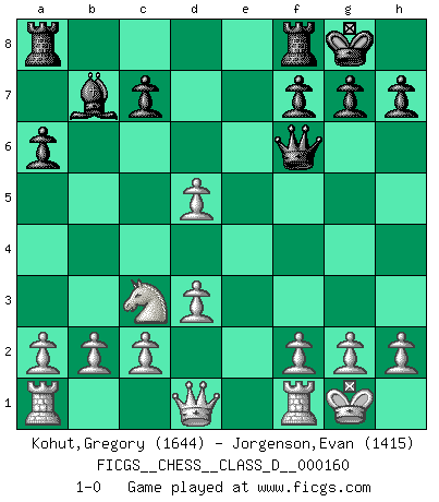 Last move : 1-0 2010 November 6 19:45:16 [Event "FICGS__CHESS__CLASS_D__000160"] [Site "FICGS"] [Date "2010.11.01"] [Round "1"] [White "Kohut,Gregory"] [Black "Jorgenson,Evan"] [Result "1-0"] [WhiteElo "1644"] [BlackElo "1415"] 1.e4 e5 2.Nf3 Nc6 3.Bb5 a6 4.Ba4 Nf6 5.O-O Be7 6.Bxc6 bxc6 7.Nc3 O-O 8.Nxe5 d6 9.Nxc6 Qd7 10.Nxe7+ Qxe7 11.d3 Bb7 12.Bg5 d5 13.Bxf6 Qxf6 14.exd5 1-0 Ruy Lopez : Exchange variation doubly deferred (DERLD) Kingside Castling by player White (move 5) Kingside Castling by player Black (move 7) Player White won this chess game. Follow this game move after move (download)Nowadays, when you're not a grandmaster at 14, you can forget about it. (Anand Viswanathan) Dieses schreckliche Gefühl, dass ich gegen eine Maschine spielte, die niemals Fehler macht, zerschmetterte meinen Widerstand. (Mark Taimanov) No solamente yo pronostico su triunfo sobre Botvinnik, sino que me adelanto y digo que probablemente Fischer es el jugador de Ajedrez mas grande que haya existido. (John Collins) Lorsque vous vous retrouvez devant une position atroce, ne tendez pas un ultime piège dérisoire avec l'intention d'abandonner si l'adversaire le déjoue ! Faites-vous plutôt un devoir de résister comme si votre vie en dépendait. Jouez le coup qui vous déplairait au centuple si vous étiez dans la peau de votre tortionnaire ! If you are going through hell, keep going. (Winston Churchill)