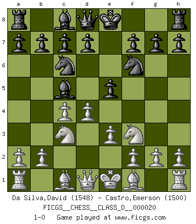Last move : 1-0 2007 January 11 5:36:15 [Event "FICGS__CHESS__CLASS_D__000020"] [Site "FICGS"] [Date "2006.11.28"] [Round "1"] [White "Da Silva,David"] [Black "Castro,Emerson"] [Result "1-0"] [WhiteElo "1548"] [BlackElo "1500"] 1.c4 e5 2.Nc3 Nf6 3.Nf3 Nc6 4.e3 Bc5 5.d4 1-0 This chess game has been lost on time (started : 2006.11.28 3:33:45) English Opening Player White won this chess game. Follow this game move after move (download)Botvinnik tried to take the mystery out of Chess, always relating it to situations in ordinary life. He used to call Chess a typical inexact problem similar to those which people are always having to solve in everyday life. (Garry Kasparov) Im Fernschach kannst du während dem Spiel rauchen. (John Christen Knudsen) El arma más poderosa en el Ajedrez, es tener la próxima movida. (David Bronstein) Les réformistes prétendent que les progrès de la théorie conduiront à la disparition des échecs, et qu'il faut, pour leur rendre vie, en remanier les règles. En réalité, qu'exprime cette affirmation? Le mépris de l'intuition, de l'imagination et de tous les autres éléments qui font des échecs un art. (Alexander Alekhine) Are you threatening me, Master Jedi ? (Chancellor Palpatine in Star Wars ep.3)