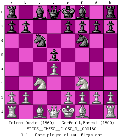 Last move : 0-1 2011 March 17 12:20:39 [Event "FICGS__CHESS__CLASS_D__000160"] [Site "FICGS"] [Date "2010.11.01"] [Round "1"] [White "Taleno,David"] [Black "Gerfault,Pascal"] [Result "0-1"] [WhiteElo "1560"] [BlackElo "1500"] 1.d4 d5 2.c4 c6 3.cxd5 cxd5 4.Nc3 Nf6 5.Nf3 Nc6 0-1 QGD Slav defense : Exchange variation Player Black won this chess game. Follow this game move after move (download)We cannot resist the fascination of sacrifice, since a passion for sacrifices is part of a Chessplayer's nature. (Rudolf Spielman) Wenn du auf das Glück wartest, wird das Leben ziemlich langweilig. (Mikhail Nekhemyevich Tal) El Ajedrez expande y enriquece tu mente. (Saudin Robovic) À la honte des hommes, on sait que les lois du jeu sont les seules qui soient partout justes, claires, inviolables et exécutées. Pourquoi l'Indien qui a donné les règles du jeu d'échecs est-il obéi de bon gré dans toute la terre, et que les décrétales des papes, par exemple, sont aujourd'hui un objet d'horreur et de mépris ? C'est que l'inventeur des échecs combina tout avec justesse pour la satisfaction des joueurs, et que les papes, dans leurs décrétales, n'eurent en vue que leur seul avantage. L'Indien voulut exercer également l'esprit des hommes et leur donner du plaisir; les papes ont voulu abrutir l'esprit des hommes. Voltaire (Dictionnaire philosophique / Garnier 1967) Warrior pose battles inner weakness and wins focus. You see that there is no war within you. You're on your own side, and you are your own strength. (Terri Guillemets)
