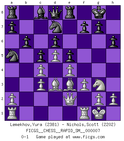 Last move : 0-1 2010 December 18 22:42:15 [Event "FICGS__CHESS__RAPID_SM__000007"] [Site "FICGS"] [Date "2010.11.01"] [Round "1"] [White "Lemekhov,Yura"] [Black "Nichols,Scott"] [Result "0-1"] [WhiteElo "2381"] [BlackElo "2202"] 1.d4 Nf6 2.c4 e6 3.Nc3 Bb4 4.e3 O-O 5.Bd3 Bxc3+ 6.bxc3 d6 7.Ne2 Re8 8.O-O b6 9.e4 e5 10.f3 h6 11.Be3 Nc6 12.Ng3 Na5 13.Qe2 c5 14.d5 Nd7 0-1 This chess game has been lost on time (started : 2010.11.01 18:9:40) Nimzo-Indian : 4.e3 O-O, 5.Bd3 Kingside Castling by player Black (move 4) Kingside Castling by player White (move 8) Player Black won this chess game. Follow this game move after move (download)A player surprised is half beaten. (Proverb) Vom Schach wurde gesagt das Leben sei dafür nicht lange genug. Aber das ist der Fehler des Lebens, nicht des Schach'. (Irving Chernev) Un buen jugador siempre tiene buena suerte. (José Raúl Capablanca) Aucun coup ne doit être joué sans but. (Pedro Damiano) An expert is a man who has made all the mistakes which can be made in a very narrow field. (Niels Bohr)