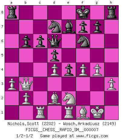 Last move : 1/2-1/2 2010 December 5 13:45:27 [Event "FICGS__CHESS__RAPID_SM__000007"] [Site "FICGS"] [Date "2010.11.01"] [Round "1"] [White "Nichols,Scott"] [Black "Wosch,Arkadiusz"] [Result "1/2-1/2"] [WhiteElo "2202"] [BlackElo "2149"] 1.Nf3 Nf6 2.g3 d5 3.Bg2 c6 4.O-O Bg4 5.c4 e6 6.d4 Nbd7 7.Qb3 Qb6 8.Nc3 Be7 9.c5 Qa6 10.h3 Bh5 11.g4 Bg6 12.Nh4 Be4 13.f3 Bg6 14.Re1 e5 15.Nxg6 hxg6 16.e3 b6 17.Bf1 Qc8 18.cxb6 axb6 19.f4 e4 20.Bd2 g5 21.Rac1 Qb8 22.Ne2 gxf4 23.exf4 Qd6 24.a3 Kf8 1/2-1/2 Reti Opening Kingside Castling by player White (move 4) This chess game ended in a draw. Follow this game move after move (download)A Chess game is divided into three stages: the first, when you hope you have the advantage, the second when you believe you have an advantage, and the third... when you know you're going to lose ! (Savielly Tartakower) Konzentriere dich auf materielle Gewinne. Nimm, was dir dein Gegner gibt, ausser es gibt einen guten Grund der dagegenspricht. (Robert James Fischer) Existen dos clases de sacrificios: los correctos y los míos. (Mikhail Tal) La guerre est enfant de la passion, la passion est enfant du narcissisme et le narcissisme est l'enfant. (...) Une autre partie ? (Thibault de Vassal) True nature is revealed in times of difficulty. (Chinese proverb)