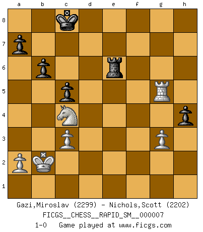 Last move : 1-0 2010 November 4 15:26:44 [Event "FICGS__CHESS__RAPID_SM__000007"] [Site "FICGS"] [Date "2010.11.01"] [Round "1"] [White "Gazi,Miroslav"] [Black "Nichols,Scott"] [Result "1-0"] [WhiteElo "2299"] [BlackElo "2202"] 1.d4 Nf6 2.c4 c5 3.d5 e6 4.Nc3 exd5 5.cxd5 d6 6.e4 g6 7.f4 Bg7 8.Bb5+ Nbd7 9.e5 dxe5 10.fxe5 Nh5 11.e6 Qh4+ 12.g3 Nxg3 13.hxg3 Qxh1 14.Be3 Bxc3+ 15.bxc3 Qe4 16.exd7+ Bxd7 17.Qd3 Qxd3 18.Bxd3 b6 19.Bg5 f6 20.Bxf6 O-O 21.Be7 Rfe8 22.d6 Rxe7+ 23.dxe7 Kf7 24.O-O-O Kxe7 25.Ne2 Bc6 26.Nf4 Re8 27.Bc4 Rf8 28.Kb2 Rf6 29.Rd2 h6 30.Bd3 g5 31.Ng6+ Kd8 32.Be4 Kc7 33.Bxc6 Rxc6 34.Ne5 Re6 35.Rd7+ Kc8 36.Rd5 h5 37.Nc4 h4 38.Rxg5 1-0 Benoni : pawn storm variation Kingside Castling by player Black (move 20) Queenside Castling by player White (move 24) Player White won this chess game. Follow this game move after move (download)Good offense and good defense both begin with good development. (Bruce A. Moon) Die Neutralität betrachte ich als eine schwere Krankheit. (Viktor Kortschnoi) La única cosa que los jugadores de Ajedrez tienen en común, es el Ajedrez. (Lodewijk Prins) Assurément je connaissais par expérience le mystérieux attrait de ce jeu royal, le seul entre tous les jeux inventés par les hommes qui échappe souverainement à la tyrannie du hasard, le seul où l'on ne doive sa victoire qu'à son intelligence ou plutôt à une certaine forme d'intelligence. Mais n'est-ce pas déjà le limiter injurieusement que d'appeler les échecs un jeu ? N'est-ce pas une science, un art ou quelque chose qui, comme le cercueil de Mahomet entre ciel et terre, est suspendu entre l'un et l'autre, et qui réunit un nombre incroyable de contraires ? [...] C'est une pensée qui ne mène à rien, une mathématique qui n'établit rien, un art qui ne laisse pas d'uvre, une architecture sans matière; et il l'a prouvé néanmoins qu'il était plus durable, à sa manière, que les livres ou que tout autre monument, ce jeu unique qui appartient à tous les peuples et à tous les temps, et dont personne ne sait quel dieu en fit don à la terre pour tuer l'ennui, pour aiguiser l'esprit et stimuler l'âme. Où commence-t-il, où finit-il ? (Stefan Zweig) The Internet is the world's largest library. It's just that all the books are on the floor. (John Allen Paulos)