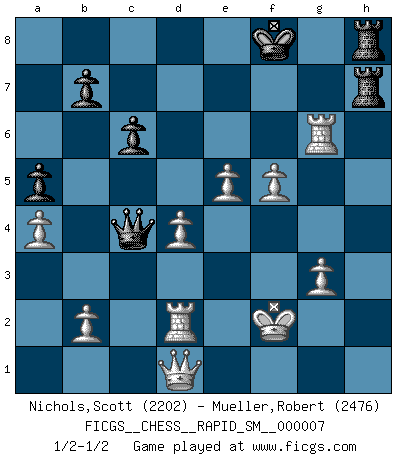 Last move : 1/2-1/2 2010 December 21 5:32:26 [Event "FICGS__CHESS__RAPID_SM__000007"] [Site "FICGS"] [Date "2010.11.01"] [Round "1"] [White "Nichols,Scott"] [Black "Mueller,Robert"] [Result "1/2-1/2"] [WhiteElo "2202"] [BlackElo "2476"] 1.Nf3 d5 2.d4 Nf6 3.c4 c6 4.Nc3 dxc4 5.a4 Bf5 6.e3 e6 7.Bxc4 Bb4 8.O-O Nbd7 9.Qe2 Bg6 10.e4 O-O 11.e5 Nd5 12.Bd2 Qa5 13.Rfc1 Ne7 14.Ne4 Bxd2 15.Nfxd2 Qb6 16.Nf3 a5 17.Ra3 Nf5 18.Ng3 Nxg3 19.hxg3 Bh5 20.Qd2 Rfd8 21.Qf4 Bg6 22.g4 Qa7 23.Ng5 h6 24.Nxe6 fxe6 25.Bxe6+ Kh7 26.Bf5 Nf8 27.Rd1 Qb8 28.g5 Bxf5 29.Qxf5+ Ng6 30.gxh6 Qc8 31.Qh5 Qe6 32.hxg7 Kxg7 33.Qg5 Qe7 34.Qf5 Rh8 35.Rg3 Qf7 36.Qg5 Rh6 37.Rf3 Qe6 38.Rf6 Qb3 39.Rd2 Qa2 40.Qg4 Rd8 41.f4 Qc4 42.Qd1 Rh4 43.g3 Rh7 44.f5 Rdh8 45.Rxg6+ Kf8 46.Kf2 1/2-1/2 Reti Opening Kingside Castling by player White (move 8) Kingside Castling by player Black (move 10) This chess game ended in a draw. Follow this game move after move (download)Chess is not like life... it has rules ! (Mark Pasternak) Weshalb minderdergeübte Spieler mit g2-g4 beginnen? Die betreffenden sind unschlüssig, ob sie nun rechts (h4) oder links (f4) beginnen sollen, und in ihrer Ratlosigkeit entschliessen sie sich nach guter Bürgerart dazu, den goldenen Mittelweg zu wählen. (Aaron Nimzowitsch) El Ajedrez es sobre todo, ¡una pelea!. (Emanuel Lasker) L'ordinateur a tué l'originalité. Il n'y a plus guère d'aventures sur l'échiquier. (Jacob Murray) When you stop learning you start dying. (Scott Adams)