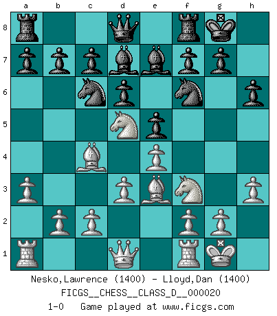 Last move : 1-0 2007 January 9 11:18:30 [Event "FICGS__CHESS__CLASS_D__000020"] [Site "FICGS"] [Date "2006.11.28"] [Round "1"] [White "Nesko,Lawrence"] [Black "Lloyd,Dan"] [Result "1-0"] [WhiteElo "1400"] [BlackElo "1400"] 1.e4 e5 2.Nf3 d6 3.Bc4 h6 4.Nc3 Nf6 5.O-O Nc6 6.d3 Bg4 7.h3 Bd7 8.Be3 Be7 9.a3 O-O 10.Nd5 1-0 This chess game has been lost on time (started : 2006.11.28 3:33:45) Philidor's defense Kingside Castling by player White (move 5) Kingside Castling by player Black (move 9) Player White won this chess game. Follow this game move after move (download)Different people feel differently about resigning. (Bobby Fischer) Um sich vor der Gefahr einer Erkältung zu schützen, sorge der wanderlustige König beizeiten für ein brauchbares Versteck. (Aaron Nimzowitsch) ¿Cual es el objetivo de jugar una apertura de gambito?... Para adquirir una reputación de ser un jugador apuesto a costo de perder el juego. (Siegbert Tarrasch) L'ordinateur a tué l'originalité. Il n'y a plus guère d'aventures sur l'échiquier. (Jacob Murray) O divine art of subtlety and secrecy! Through you we learn to be invisible, through you inaudible and hence we can hold the enemy's fate in our hands. (Sun Tzu)