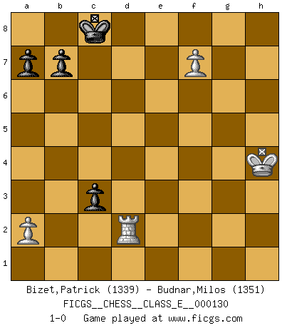 Last move : 1-0 2011 February 20 8:32:9 [Event "FICGS__CHESS__CLASS_E__000130"] [Site "FICGS"] [Date "2010.11.02"] [Round "1"] [White "Bizet,Patrick"] [Black "Budnar,Milos"] [Result "1-0"] [WhiteElo "1339"] [BlackElo "1351"] 1.e4 e5 2.Nf3 Nc6 3.d4 exd4 4.Bc4 Bc5 5.c3 Nf6 6.Bg5 h6 7.Bh4 g5 8.Nxg5 hxg5 9.Bxg5 Ne5 10.Bb3 c6 11.cxd4 Bb4+ 12.Nc3 Qe7 13.Bxf6 Qxf6 14.dxe5 Bxc3+ 15.bxc3 Qxe5 16.Qd4 Qxd4 17.cxd4 d6 18.f3 Bd7 19.h4 f6 20.g4 O-O-O 21.Kf2 Rde8 22.Bf7 Re7 23.Bg6 Be8 24.Bf5+ Bd7 25.Bxd7+ Rxd7 26.Kg3 d5 27.e5 fxe5 28.dxe5 d4 29.f4 d3 30.f5 d2 31.h5 Rhd8 32.Rad1 Rd3+ 33.Kf4 Rd3d4+ 34.Kg3 Rg8 35.Rh4 c5 36.h6 c4 37.h7 Rh8 38.g5 Rxh4 39.Rxd2 Rh8xh7 40.g6 Rh8 41.g7 Rg8 42.Kxh4 Rxg7 43.f6 Rc7 44.e6 c3 45.f7 Rxf7 46.exf7 1-0 Scotch gambit Queenside Castling by player Black (move 20) 10 pieces endgame at move 42 : White KRPPP , Black KRPPP WHITE : King + 1 Rook 3 Pawns BLACK : King + 1 Rook 3 Pawns 9 pieces endgame at move 45 : White KRPP , Black KRPPP WHITE : King + 1 Rook 2 Pawns BLACK : King + 1 Rook 3 Pawns 8 pieces endgame at move 46 : White KRPP , Black KPPP WHITE : King + 1 Rook 2 Pawns BLACK : King + 3 Pawns Player White won this chess game. Follow this game move after move (download)Avoid the crowd. Do your own thinking independently. Be the Chess player, not the Chess piece. (Ralph Charell) Modernes Schach erfordert enorme Anspannung. Es ist für einen normalen Menschen unmöglich das auszuhalten. (Viktor Kortschnoi) El Ajedrez es la vida. (Bobby Fischer) Aux échecs, les retours au sommet sont rares : les dommages psychologiques consécutifs à une défaite sont trop sévères. (Daily Telegraph) Memory is a way of holding onto the things you love, the things you are, the things you never want to lose. (from the television show: The Wonder Years)