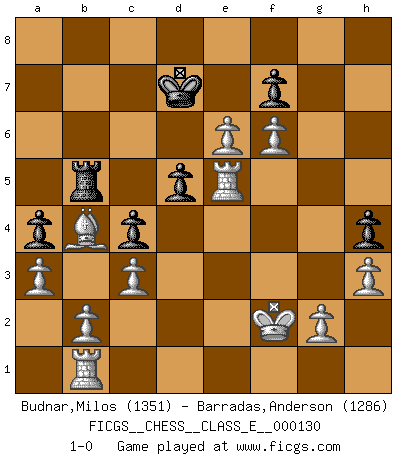 Last move : 1-0 2010 November 27 20:27:20 [Event "FICGS__CHESS__CLASS_E__000130"] [Site "FICGS"] [Date "2010.11.02"] [Round "1"] [White "Budnar,Milos"] [Black "Barradas,Anderson"] [Result "1-0"] [WhiteElo "1351"] [BlackElo "1286"] 1.e4 c5 2.Nf3 e6 3.d4 cxd4 4.Nxd4 Bc5 5.Bc4 a6 6.O-O b5 7.Bb3 Bxd4 8.Qxd4 Nc6 9.Qxg7 Nf6 10.Qxh8+ Ke7 11.Qxd8 Nxd8 12.Bg5 Bb7 13.e5 Nc6 14.exf6+ Ke8 15.c3 Ne5 16.Nd2 d5 17.Bc2 h5 18.Rfe1 Nc4 19.Nxc4 bxc4 20.Bh6 Kd7 21.Bg7 Re8 22.Ba4+ Bc6 23.Bxc6 Kxc6 24.Re5 h4 25.h3 Rb8 26.Rab1 a5 27.a3 Kd6 28.f4 Rb5 29.Kf2 a4 30.Bf8+ Kd7 31.f5 Ke8 32.Bb4 Kd7 33.fxe6+ 1-0 Sicilian defense Kingside Castling by player White (move 6) Player White won this chess game. Follow this game move after move (download)Best by test: 1. e4 (Bobby Fischer) Strategie ist, wie man ein Mädchen auf den Rücksitz bekommt. Taktik ist, was man tut, wenn man dann dort ist. (Anonymous) Vive, pierde y aprende al observar a tu oponente como gana. (Amber Steenbock) Les Echecs sont affaire de jugement sensible. Savoir quand frapper et quand esquiver. (Fischer) The age of a woman doesn't mean a thing. The best tunes are played on the oldest fiddles. (Ralph Waldo Emerson)